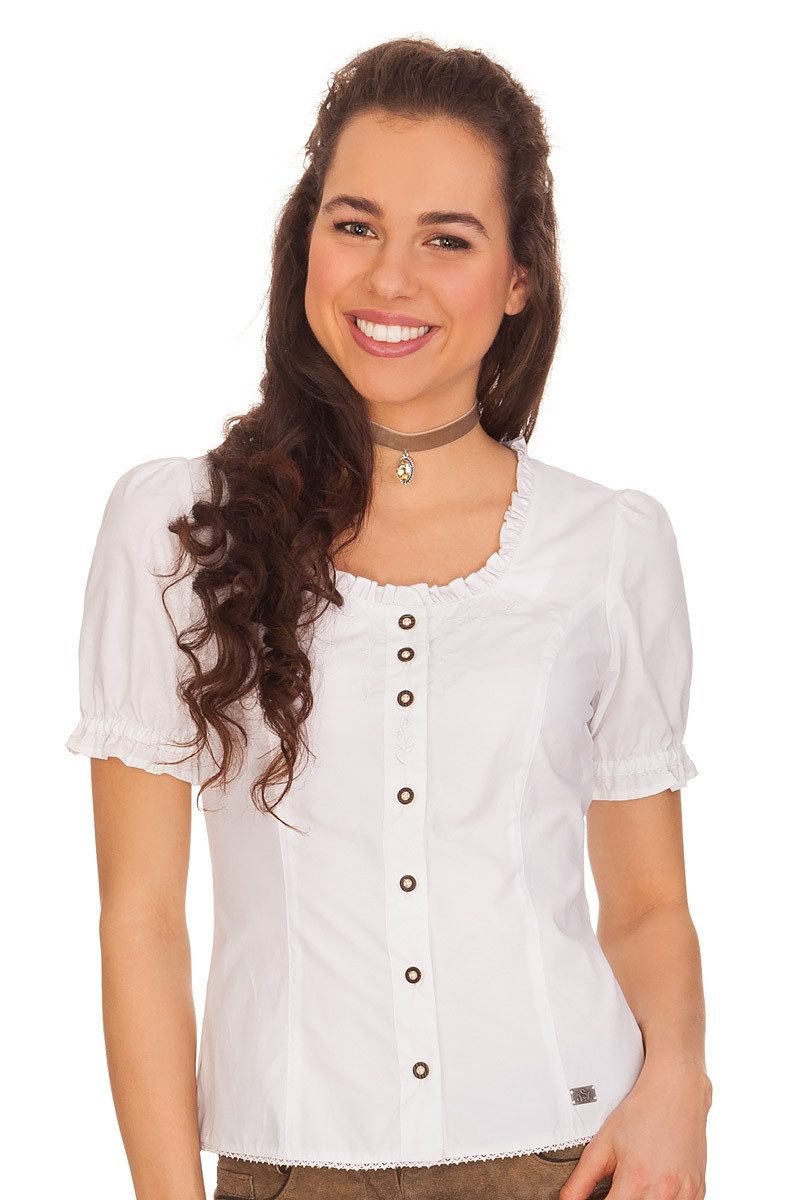 Die geschmackvolle Trachtenbluse Grafenau im taillierten Schnitt ist eine perfekte Kombiniererin und überzeugt mit toll gestickten Ranken und Blumen im Brustbereich und Knopfleiste, süßen Puffärmel, einen schönen Ausschnitt mit Rüschen und Häkelborten. Die Knöpfe passen mit ihrer traditionellen Hirschhorn-Optik perfekt dazu, ebenso die wundervolle Häkelborte am Saum. Am Rücken kann die Bluse für eine hübsche Taille noch enger geschnürt werden. Die Damenbluse ist ein besonders geschmackvolles Trachtenstück aus dem Hause Spieth und Wensky und trägt sich wunderbar zur Trachtenjeans und Krachledernen.