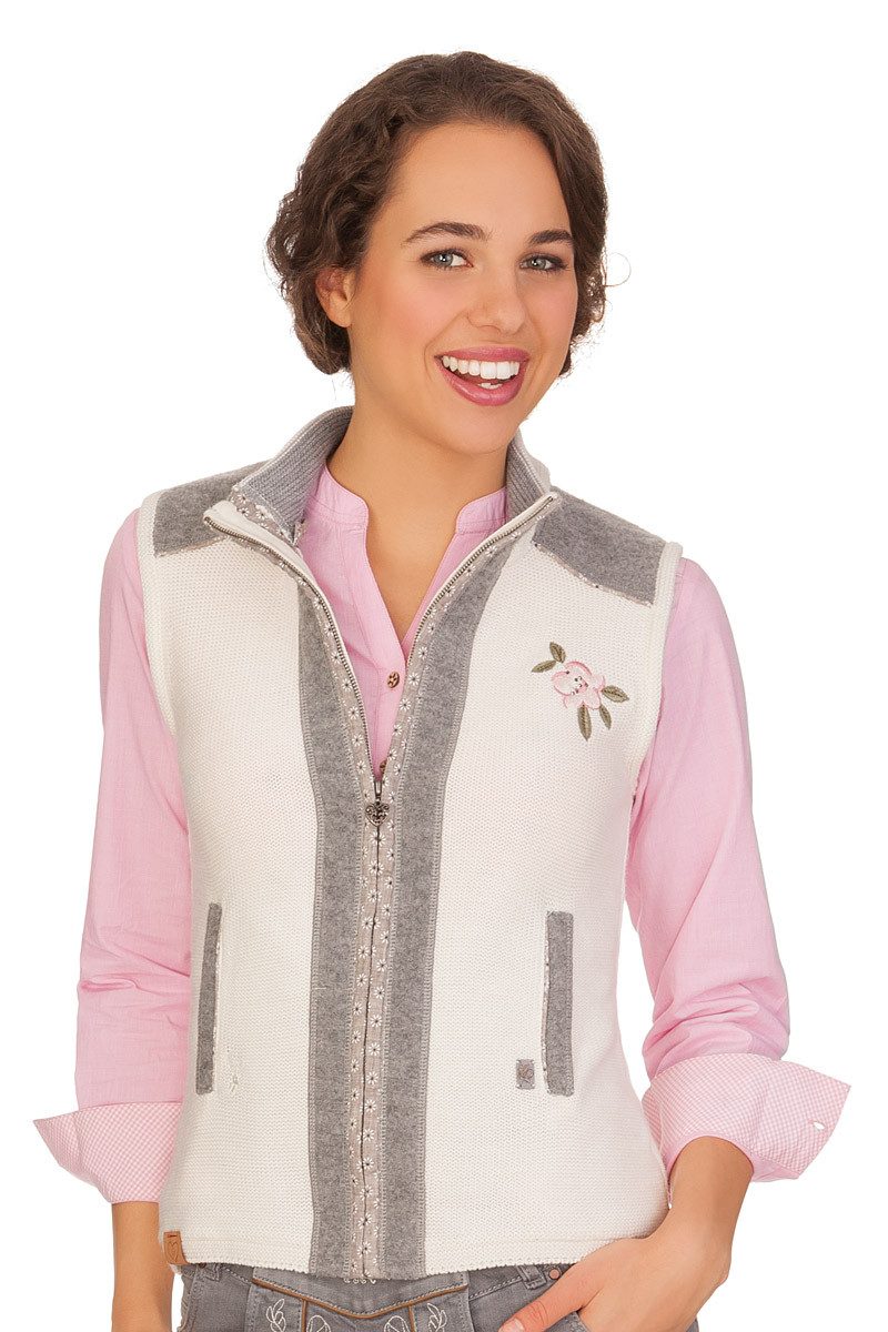 Die zauberhafte, tailliert geschnittene Strickweste Grain mit ihrer wundervollen Blütenstickerei mit Glitzersteinchen auf der linken Brust und dem entzückenden Rücken mit schönem floralen Druck lässt Blumen verliebte Madlherzen höher schlagen. Sie wird mit einem Reißverschluss vorn mit süßem Herz-Zipper geschlossen und besitzt eine Kapuze mit Tunnelzug und feschen Kordeln, die am Stehkragen abgeknöpft werden kann. Die weiche, feine Merinowolle hält wunderbar warm, sowie auch die Walkeinsätze an Kapuze, im Schulterbereich, an der Reißverschlussleiste und an den Taschen. Blumige Stoffeinsätze und Paspeln zieren hübsch die Weste. Zwei Eingrifftaschen befinden sich vorn mit einer kleinen Hirschkopfstickerei über der rechten Tasche. Die bezaubernde Damen Strickweste im geschmackvollen Rechtsstrick passt super zur Lederhose und auch zur Jeans und verleiht der Trägerin einen jungen, sportlichen Look.