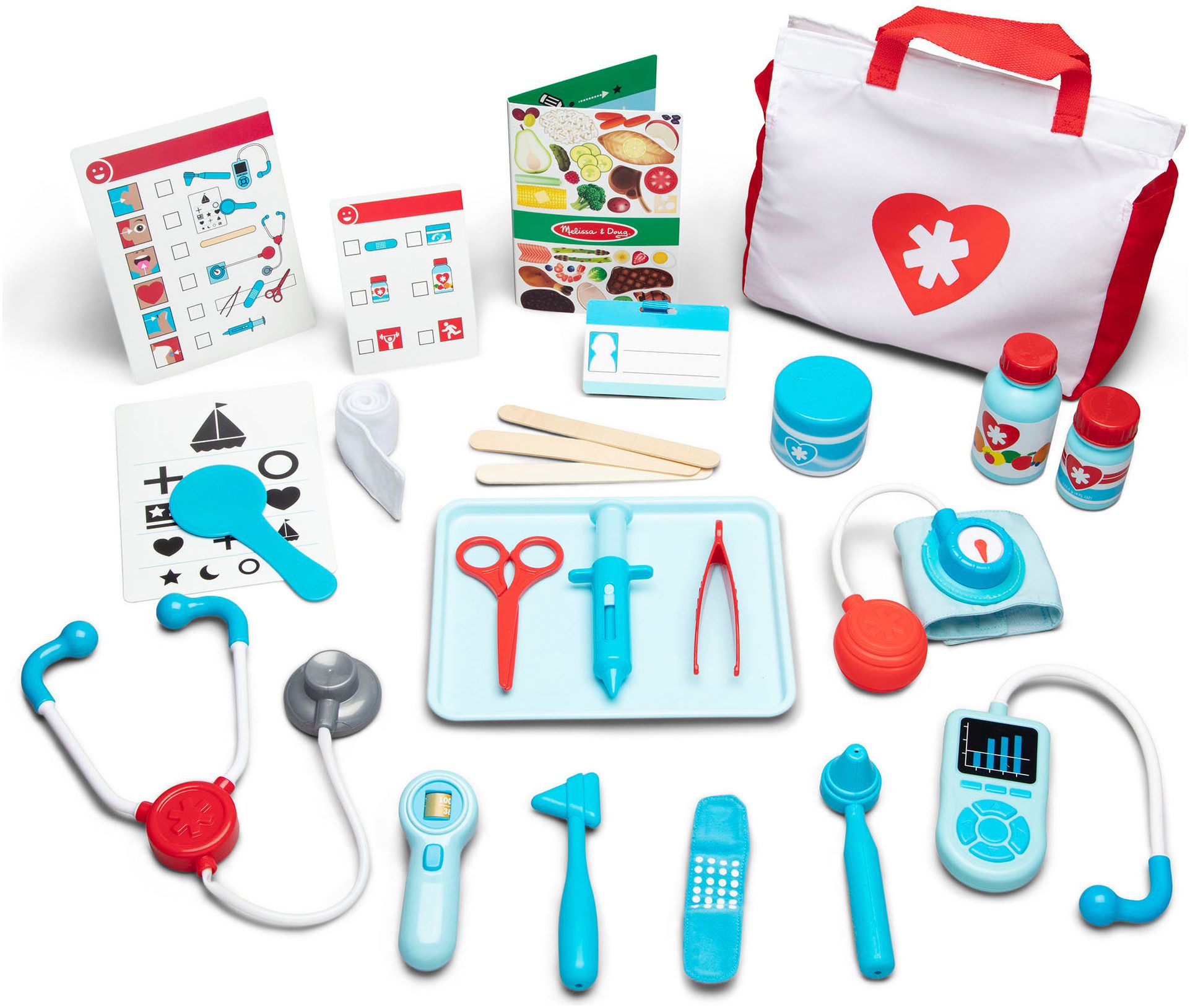 Kinder lieben es, in die Rolle von Erwachsenen zu schlüpfen und in kreativem Rollenspiel das, was sie im Alltag erleben, nachzuahmen. Dabei entwickeln sie ihre Vorstellungskraft, psychosoziale und sprachliche Fähigkeiten sowie Feinmotorik und mehr. Всіs Fähigkeiten, die sie im echten Leben benötigen. Doktor Spielsets gibt es viele, doch das von Melissa & Doug zeichnet sich durch 25-teiliges Zubehör aus, das mehr als nur Untersuchungsinstrumente bietet. Mit verschiedenen Diagnose-, Behandlungs- und Ernährungskarten, die mit abwischbaren Stiften beschriftet werden können, bietet das Set viele tiefergehende Spielmöglichkeiten. Somit wächst das Set mit der Entwicklung des Kindes: vom einfachen Untersuchen bis hin zum komplexen Praxisablauf. Seit über 35 Jahren steht die Marke Melissa & Doug für hochwertiges Spielzeug aus den Bereichen Rollenspiel, Bauen und Konstruieren, Puzzles und Motoriktafeln sowie Kreativ. Всі Produktgruppen vereint der Anspruch, Kinder in ihrer Entwicklung ganzheitlich zu fördern und einen überraschenden Mehrwert zu liefern.