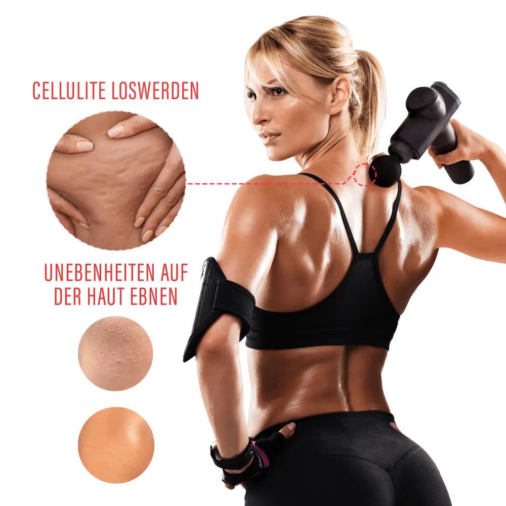 Mit 6 Aufsätzen (Ball, Flachkopf, Haken, Kissen u.a.) lassen sich unterschiedliche Muskelgruppen gezielt behandeln. 12 mm Hublänge und 20 kg Druckkraft sorgen für spürbare Tiefenwirkung – auch bei Cellulite.