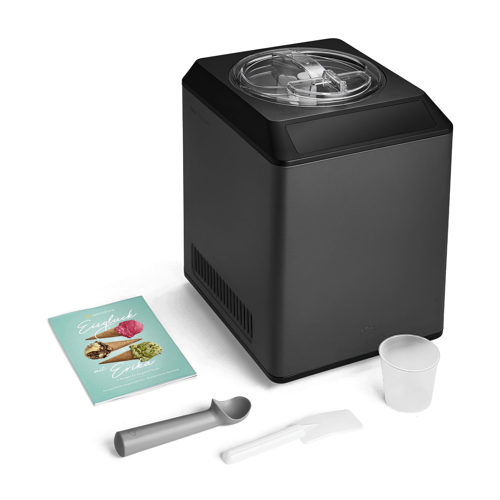 Eismaschine, Edelstahlbehälter, Rührteil, Spatel, Messbecher, Deckel mit Nachfüllklappe, Eisportionierer, ausführliches Rezeptheft und Bedienungsanleitung. Всі abnehmbaren Teile sind spülmaschinengeeignet für eine einfache Reinigung.