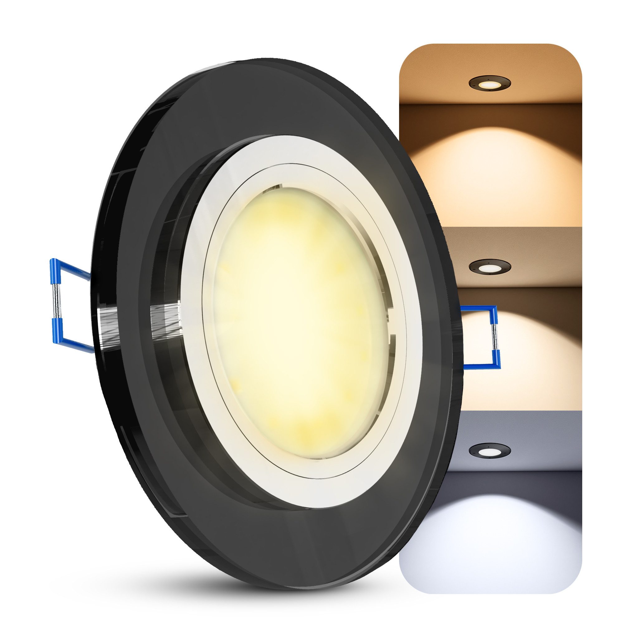 Lieferumfang | 1x Glas Einbaustrahler schwarz rund-1x LED Leuchtmittel Modul Dimmbar- |