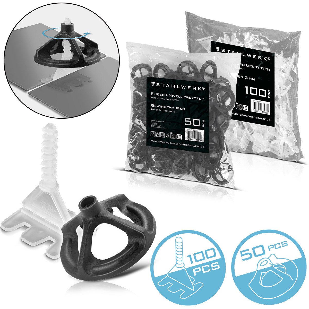 Lieferumfang | 1 x STAHLWERK Fliesen-Nivellier-System Nivellier-Zuglasche mit Gewinde (100 Stk.), 1 x STAHLWERK Fliesen-Nivellier-System Wiederverwendbare Nivellier-Gewindehauben (50 Stk.) |