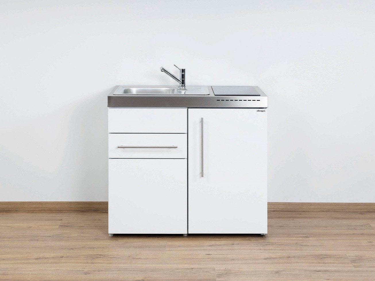 Die Miniküche Premiumline MP 100 S ist ein vielseitiges Modell, welches im Büro oder als Singleküche Verwendung findet. Aufgrund ihrer kompakten Abmessungen (B/H/T: 100 cm/89 cm/60 cm) eignet sich diese Miniküche optimal für kleine Küchenräume oder Räumlichkeiten. Dabei überzeugt die Premiumküche mit ihrer Qualität: Die Pantryabdeckung ist aus korrosionsbeständigem Edelstahl gefertigt. Der Unterbau besteht aus Metall und der Korpus hat zusätzlich eine Pulverbeschichtung. Die angebrachte Schublade ist mit Softclose versehen. Außerdem hat die Tür im Spülunterbau einen Touch-Verschluss. Die Oberflächen der Miniküche sind außerdem einfach zu reinigen. Die Küche hat außerdem ein Becken und eine Ab –und Überlaufgarnitur. Die Edelstahl-Pantryabdeckung und Spüle hat eine Materialstärke von 0,8mm. Die pulverbeschichteten Premiumfronten der Miniküche sind doppelwandig und gefüllt. Die Küche wird steckerfertig und montiert geliefert. Für eine modische Integration in jedes Ambiente ist die Miniküche in verschiedenen Farben oder in Edelstahlausführung erhältlich.