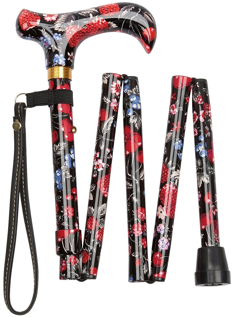 Früchte und Blumen in rot und weiß auf schwarzem Grund sind das Gesicht dieses farbenfrohen Modells COCKTAIL. Der elegante Derby Griff aus Acryl hat das gleiche Design wie der Faltstock aus Leichtmetall. Dieser ist fünffach faltbar auf ein Packmaß von ca. 30 cm und höhenverstellbar auf eine Gesamtlänge von 82-90 cm. Ein schlanker Stock mit nur 19mm Durchmesser, ebenso ein Leichtgewicht mit ca. 275 Gramm. Sehr praktisch ist die gleich montierte Stockschlaufe Ein passender Gummipuffer bildet den Abschluss des Stockes, der in einem Klarsicht Etui geliefert wird .