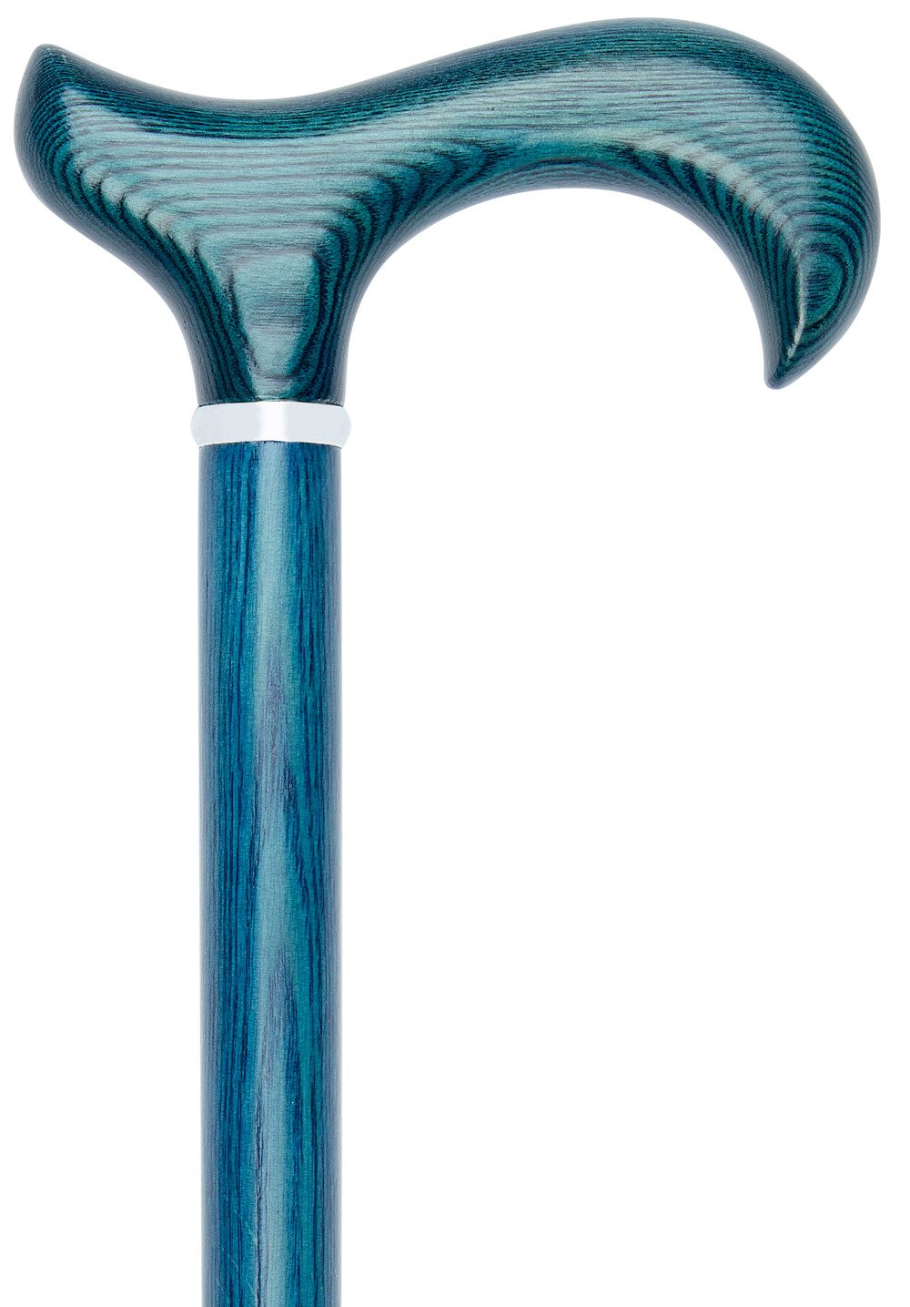 Der Stock wird leicht geflammt, um die schöne antik wirkende Maserung des Eschenholzes hervorzuheben. Anschließend wird der Stock navy-blau gebeizt und seidenmatt lackiert. Der Griff wird mit einem eleganten Chromring aufgesetzt.