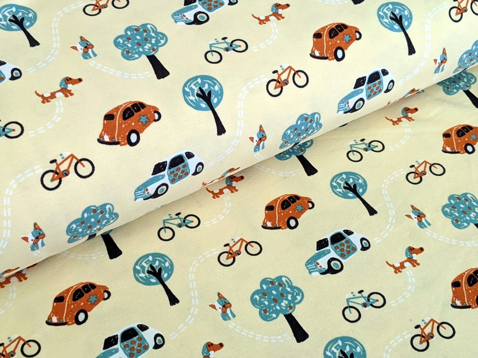 Stoff Baumwolljersey Ausflug zum Park Pastell Gelb Stoff Meterware