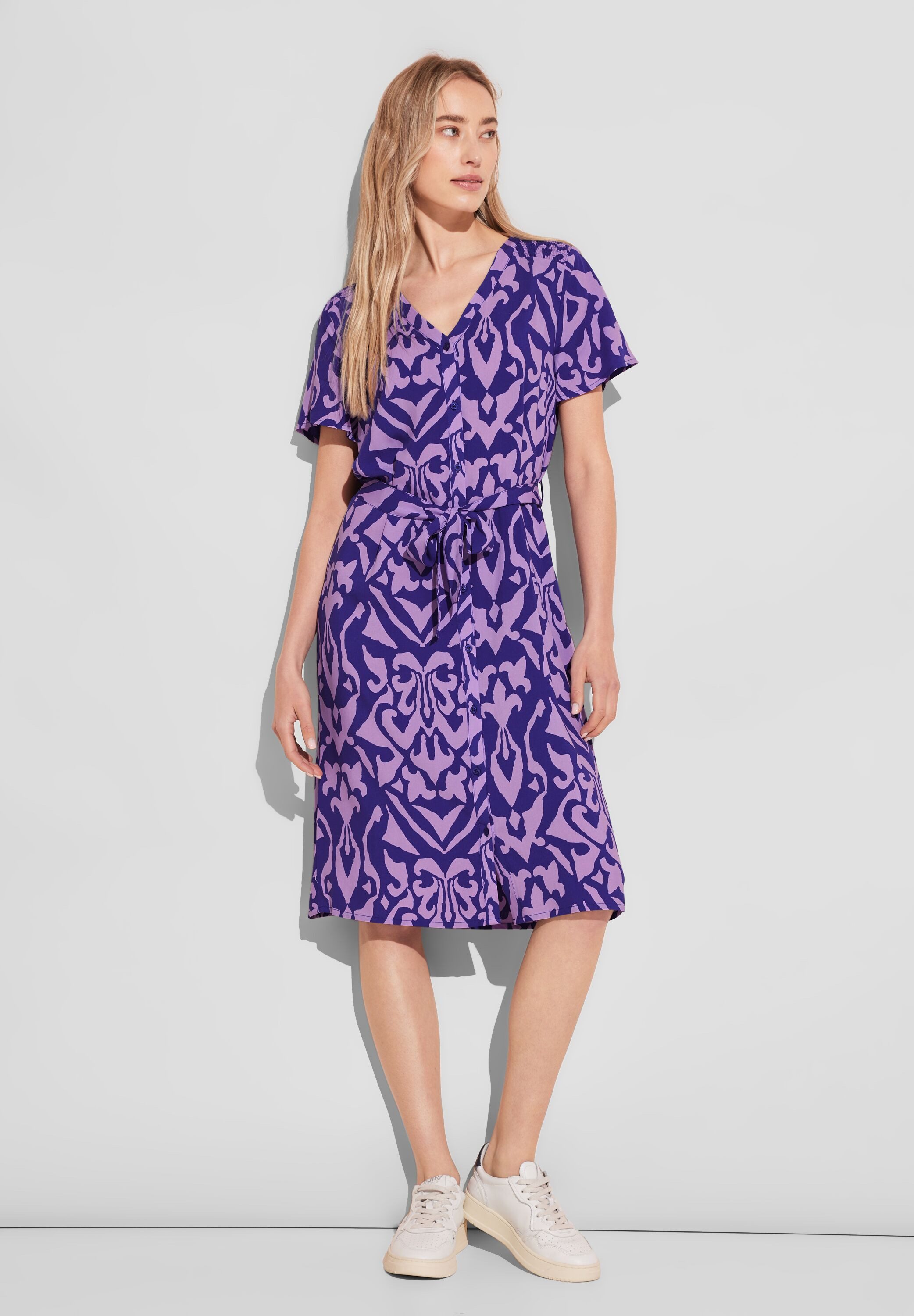 Street One Damen Print Kleid, Viskose knielang, leicht gewellter Kurzarm, V-Ausschnitt und Knopfleiste, dekorative Raffung, seitliche Schlaufen und Bindegürtel. Das Print Kleid von Street One für Damen ist ein stilvolles Viskosekleid, das mit einem leicht gewellten Kurzarm und einem schmeichelhaften V-Ausschnitt mit Knopfleiste begeistert. Eine dekorative Raffung verleiht dem Kleid eine feminine Note, während seitliche Schlaufen und ein Bindegürtel die Taille betonen und eine individuelle Passform ermöglichen. Dieses vielseitige Kleid ist perfekt für verschiedene Anlässe und sorgt für einen trendigen Look.