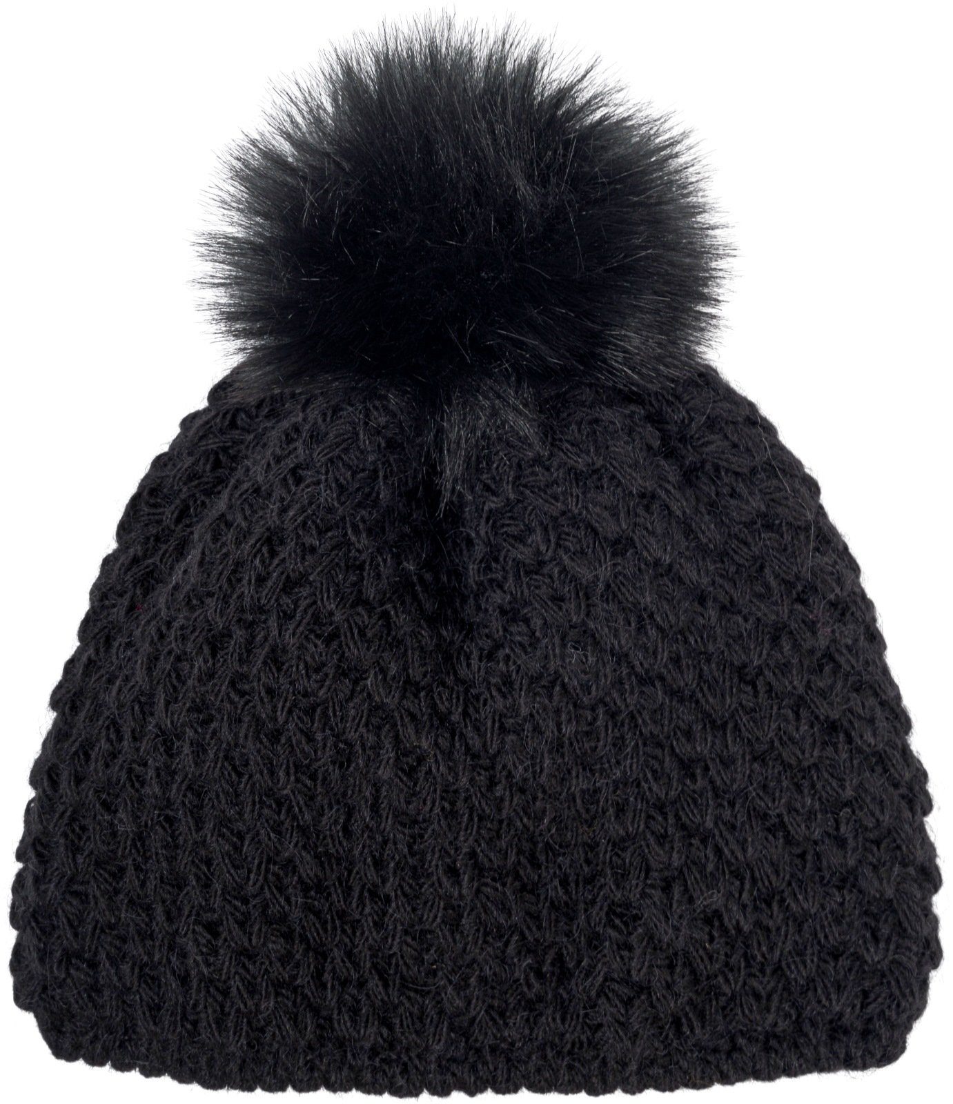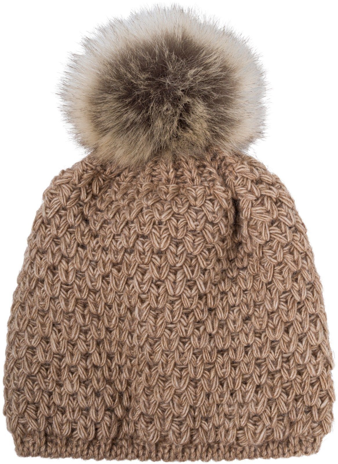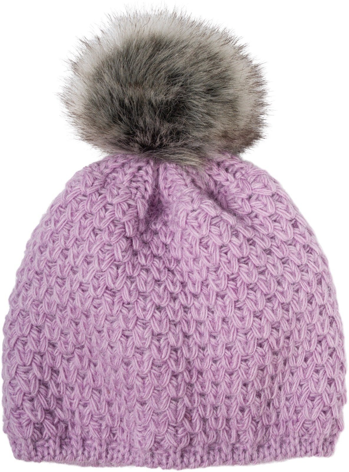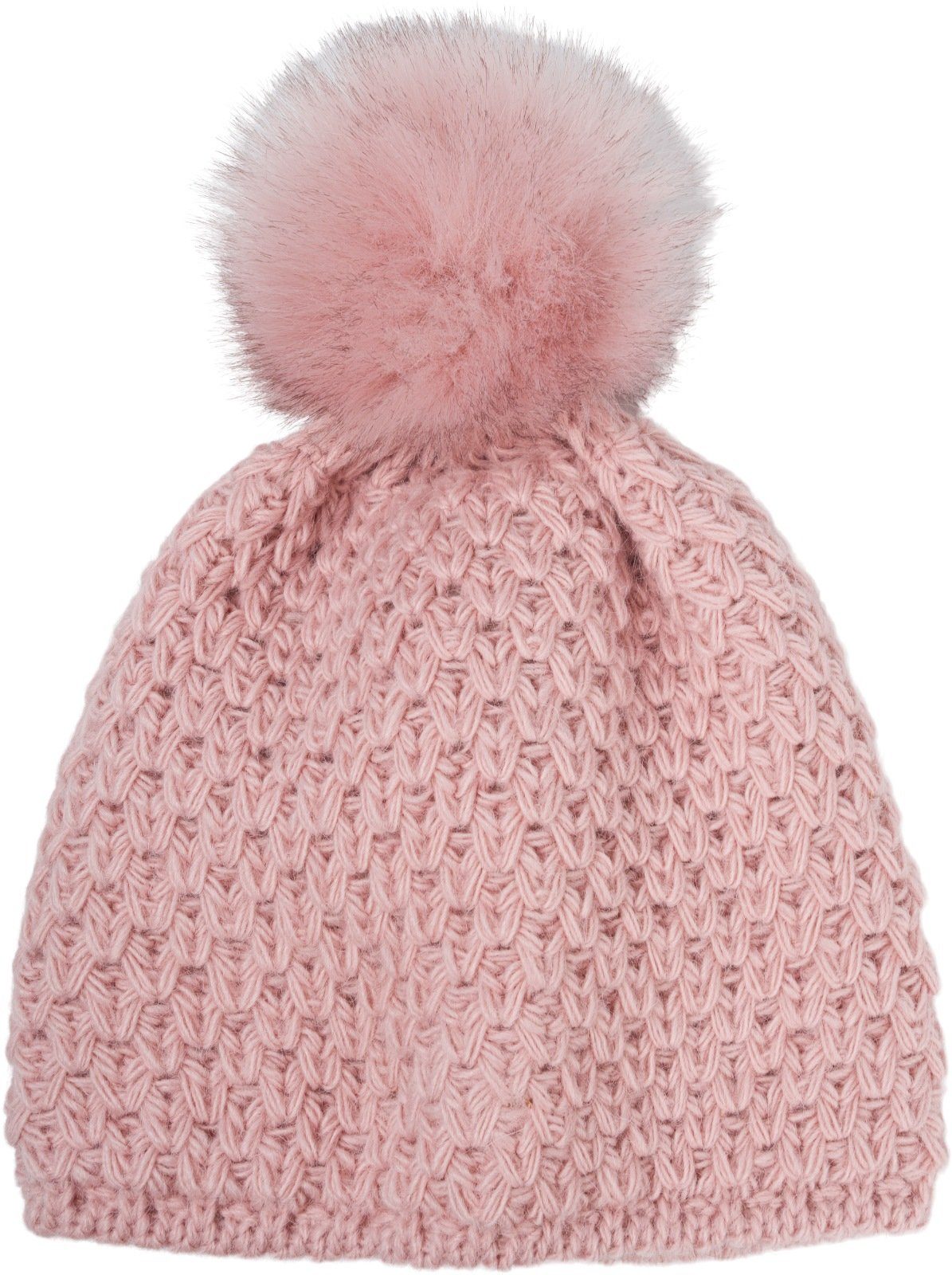 styleBREAKER Kinder Kunstfell Bommelmütze Gehäkelt mit V-Muster und Thermo-Fleece Futter.