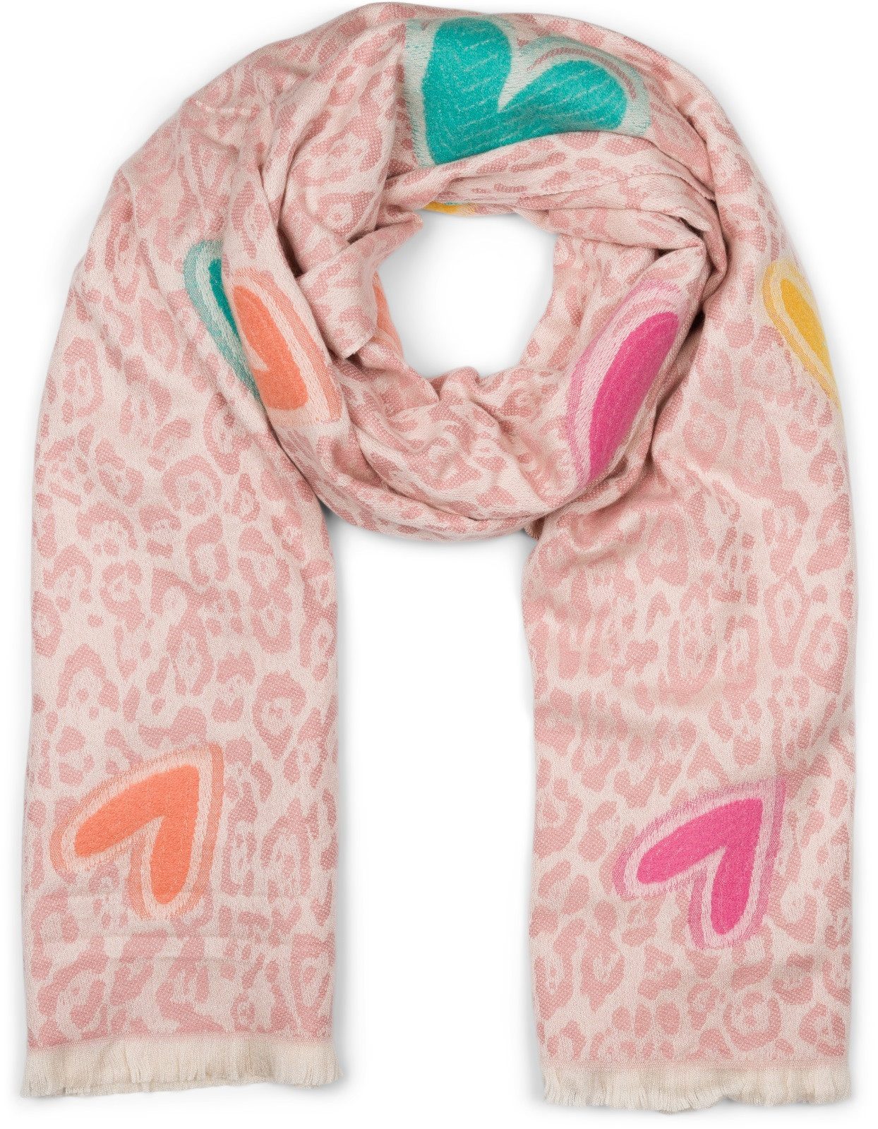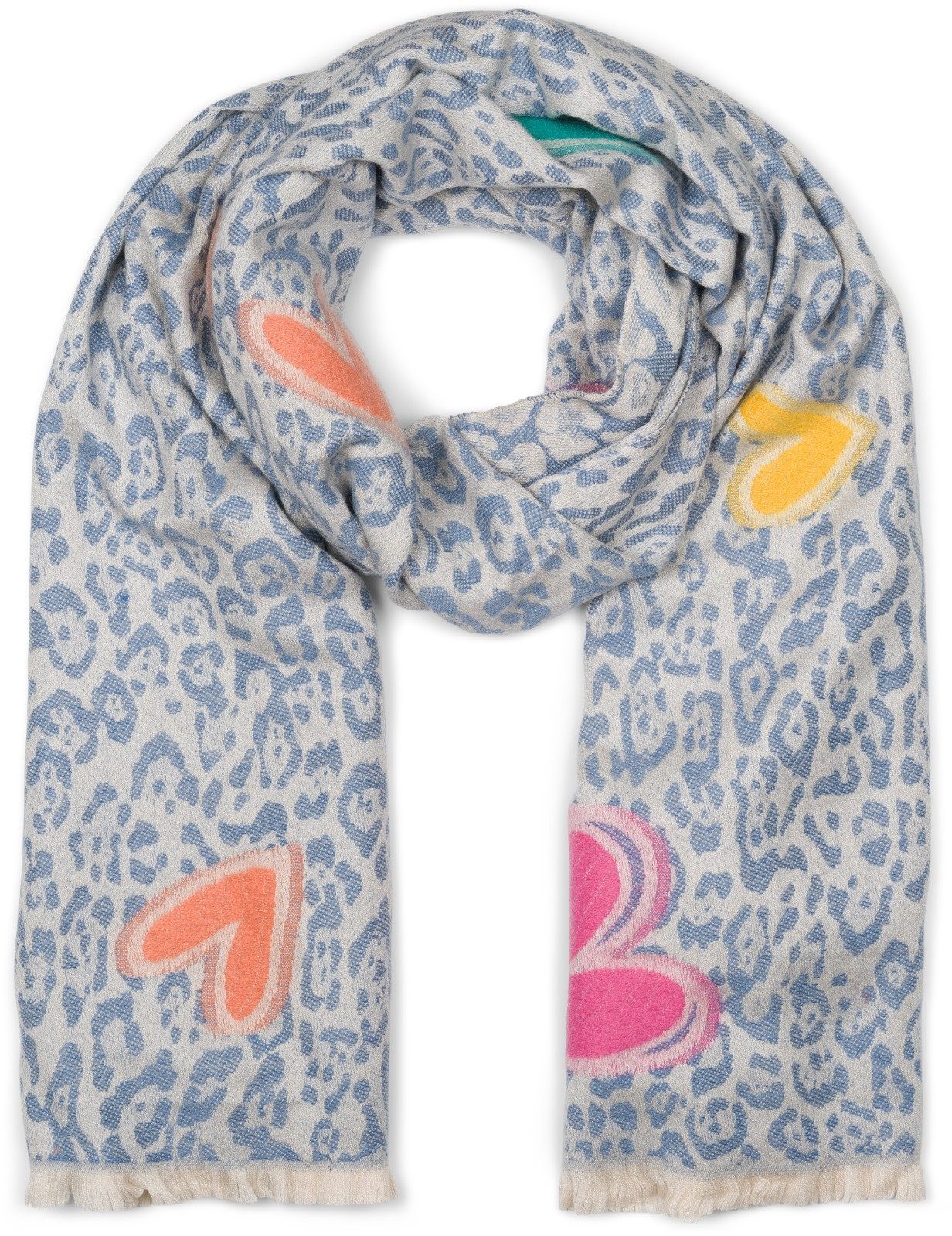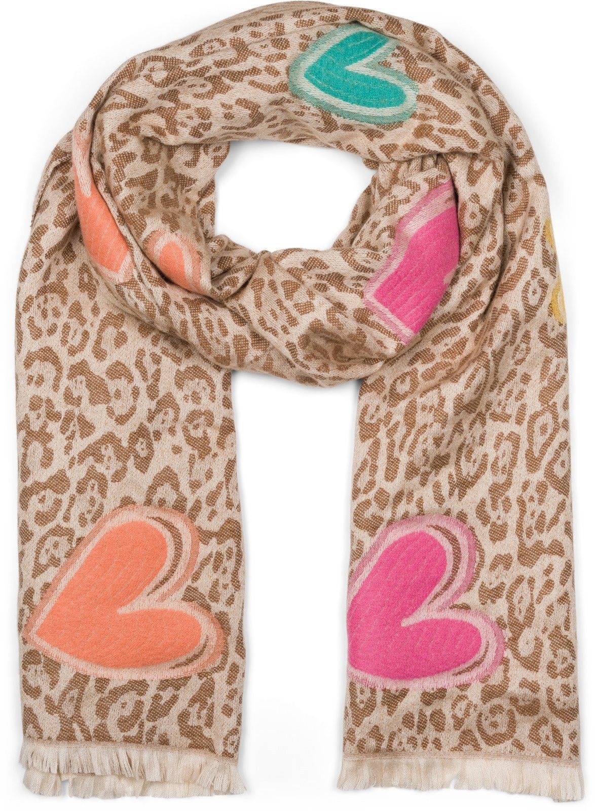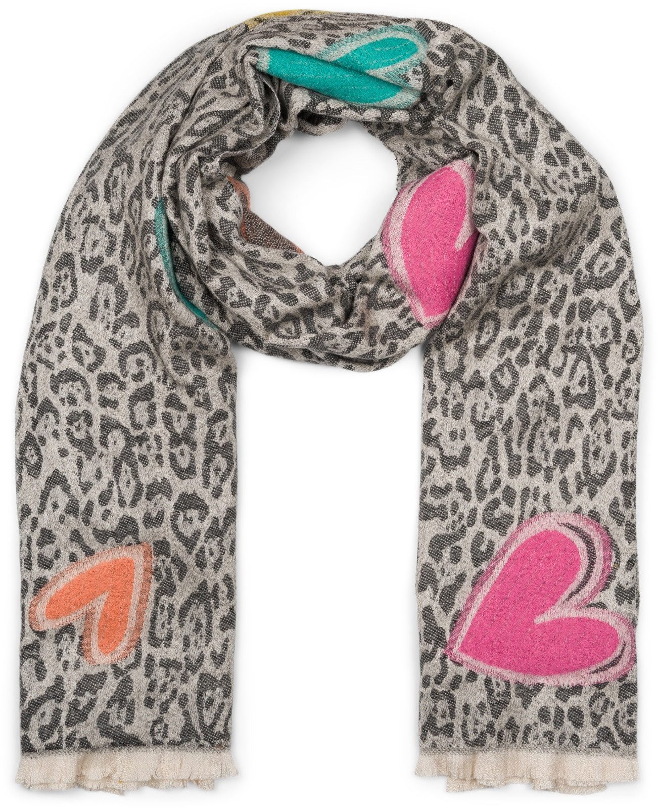 styleBREAKER – Damen hochwertiger Schal mit Leopardenmuster und liebevoll gestickten Herzen.