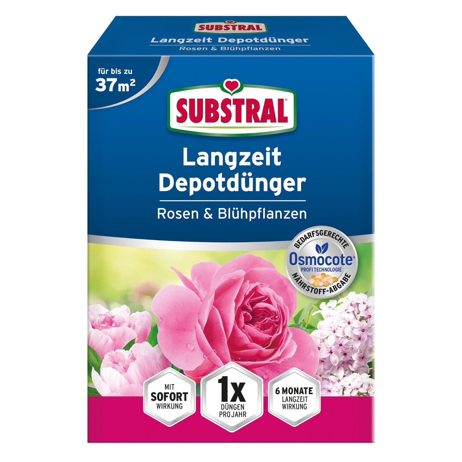 Substral Langzeit Depotdünger Rosen & Blühpflanzen ist für alle Rosensorten, Blühsträucher wie z.B. Bauernjasmin, Flieder, Weigelie, Schneeball und alle Blühstauden wie z.B. Astern, Lilien, Phlox, Pfingstrosen, Rittersporn und Rudbeckie.