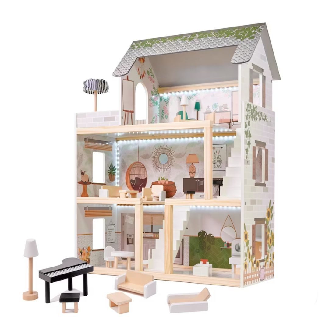 Entdecke unser zauberhaftes Holz-Puppenhaus im Boho-Stil, das Kinderaugen zum Leuchten bringt. Dieses einzigartige dreistufige Haus wurde nach den Prinzipien des Boho-Designs gestaltet. Das Ergebnis ist ein gemütliches Interieur in warmen Erdtönen, das einen perfekten Rückzugsort für Puppen, Maskottchen und Figuren Deines Süßlings bietet.