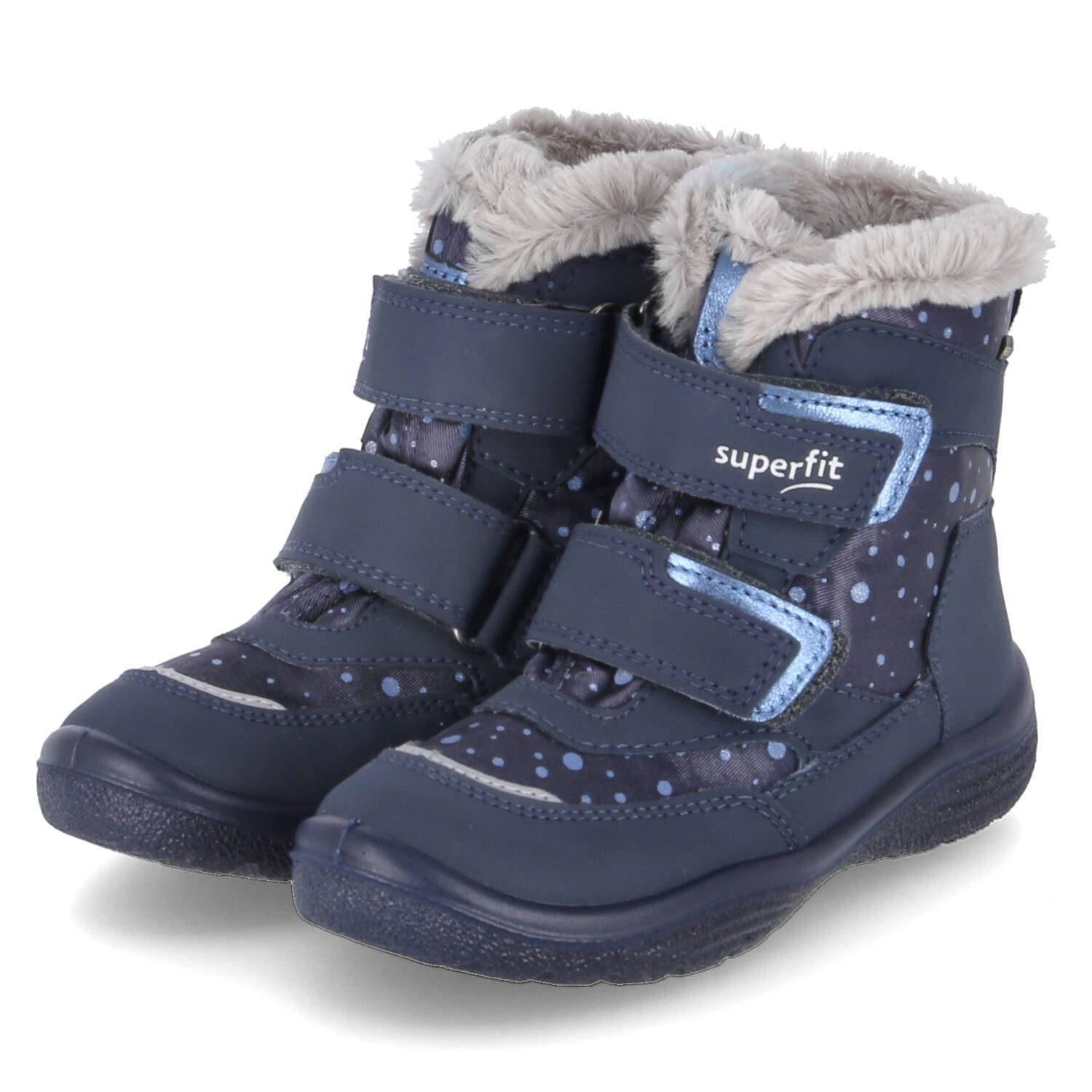 Superfit Mädchen Winterboots/ Stiefeletten CRYSTAL Blau Leder-Textil-Synthetik-Mix - Punkteprint - wasserfest, atmungsaktiv, isolierend (GoreTex) - zwei Klettriemen - verstärkter Fersen und Zehenbereich - gepolsterter Einstieg mit Kunstfellkragen - warmes Textilfutter - Wechselfußbett - flexible Profilsohle