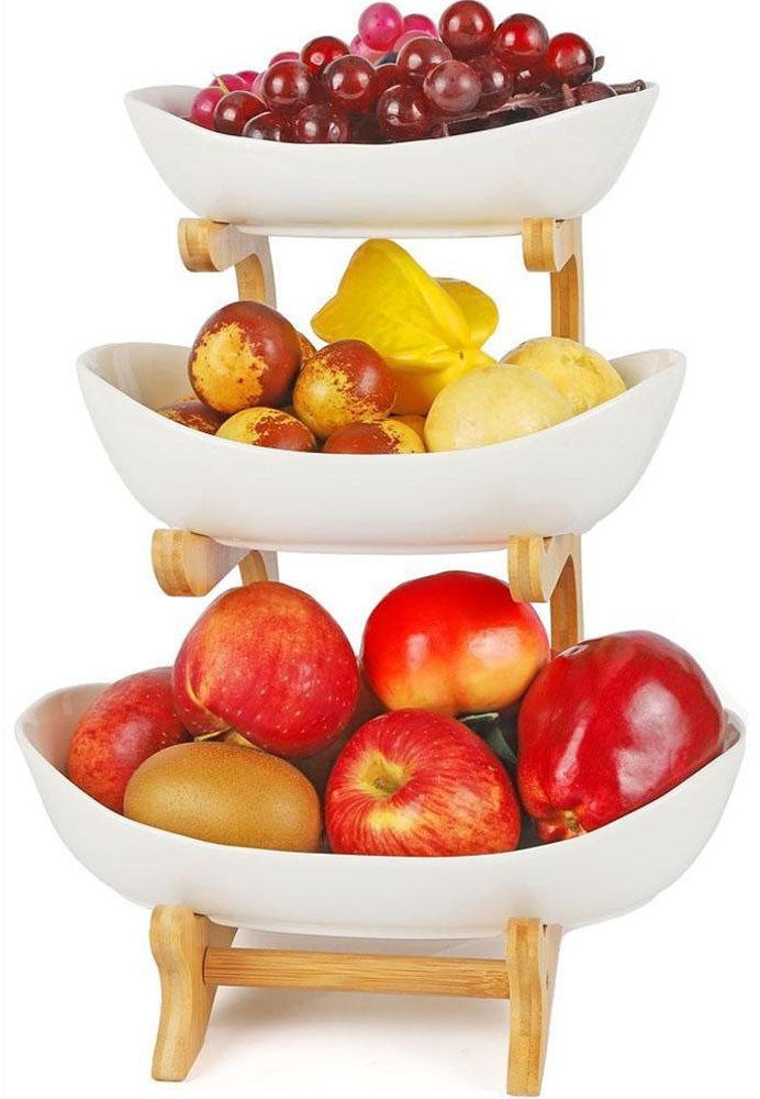 3-stufige Obst Etagere aus Keramik und Holz – Elegante Präsentation für Ihre Früchte und Snacks