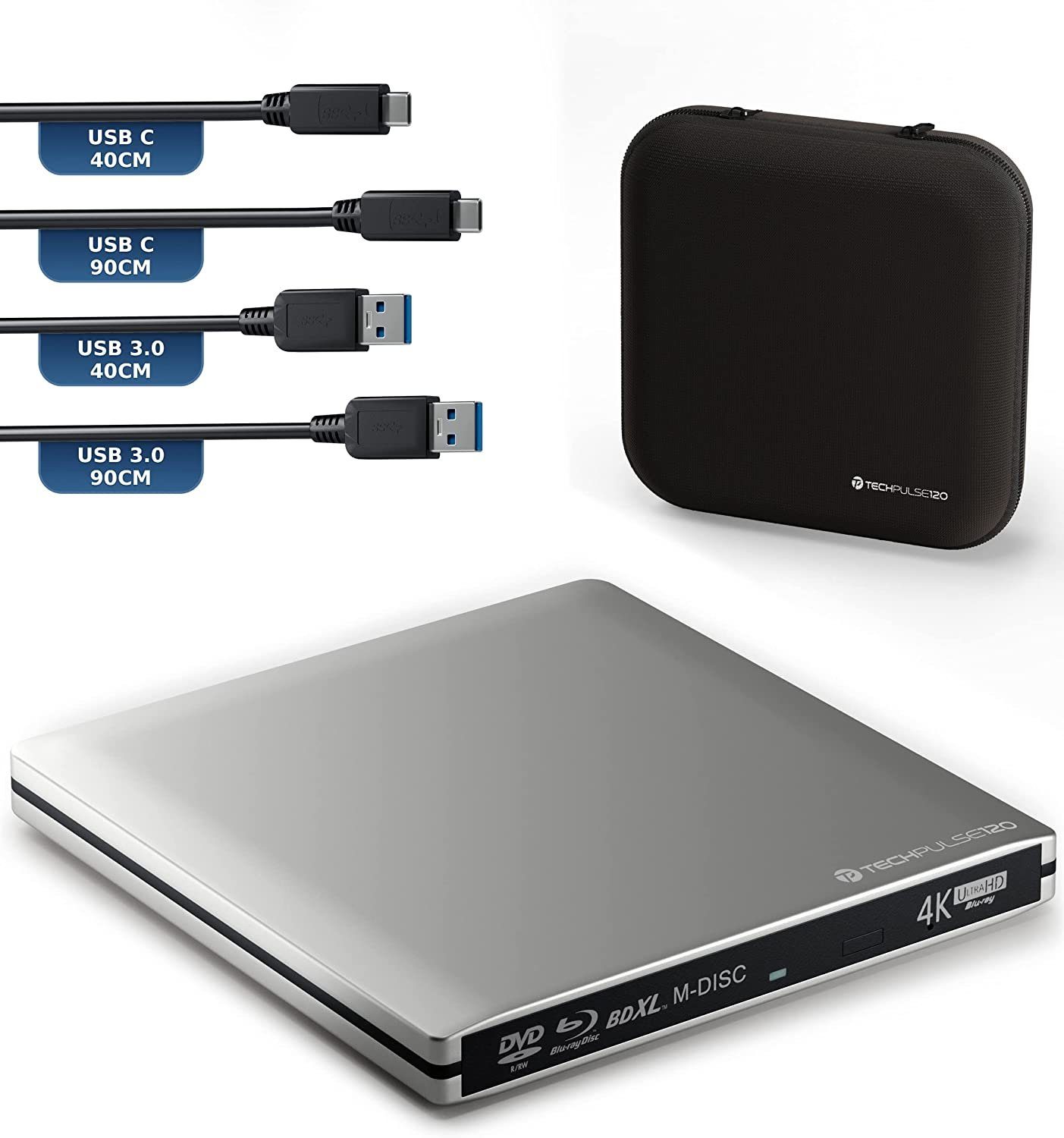 Unser USB 3.1 Imperator Paket in Silber! Tragbarer UHD 4K Brenner, Laufwerkstasche, 1x USB 3.0 Kabel 50cm, USB 3.0 Kabel 90cm, 1x USB Typ-C Kabel 50cm, 1x USB Typ-C Kabel 90cm / (Standard Lieferumfang sind 50cm lange Kabel, beim Imperator Paket gibt es 90cm USB3 & USBC / Tasche on Top ).