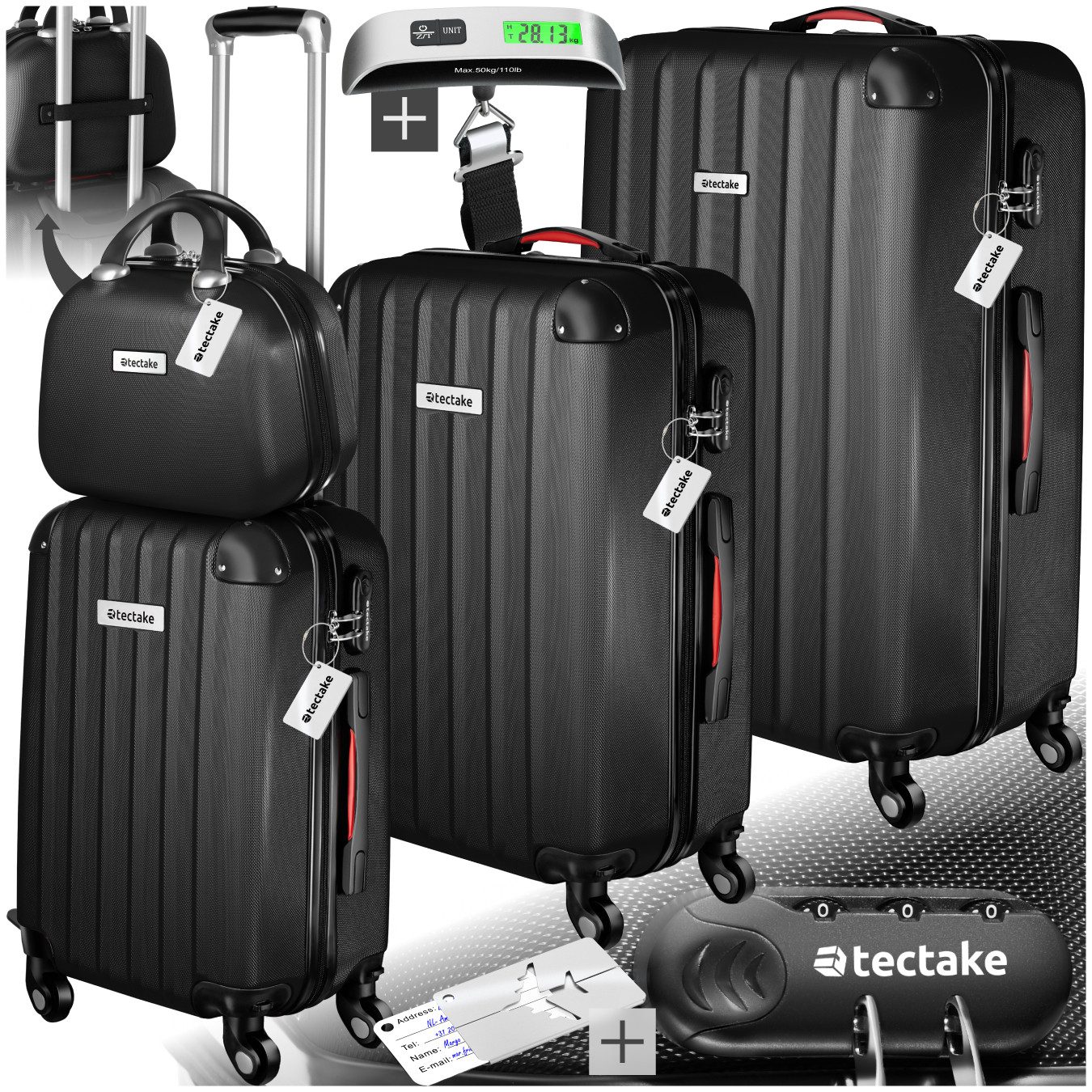 Lieferumfang | Beauty-Case, Koffer M, Koffer L, Koffer XL, Kofferwaage, 4 Kofferanhänger, Bedienungsanleitung, Zahlenschloss |
