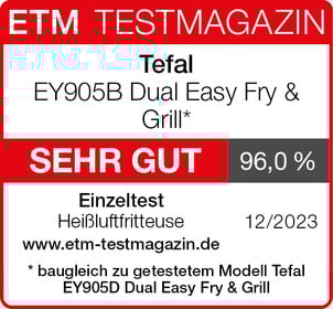 Testurteil von ETM TESTMAGAZIN vom 24.11.2023, Ausgabe 12/2023, Seite 50-65: "SEHR GUT | 96,0 % - baugleich zu getestetem Modell Tefal EY905D Dual Easy Fry & Grill"