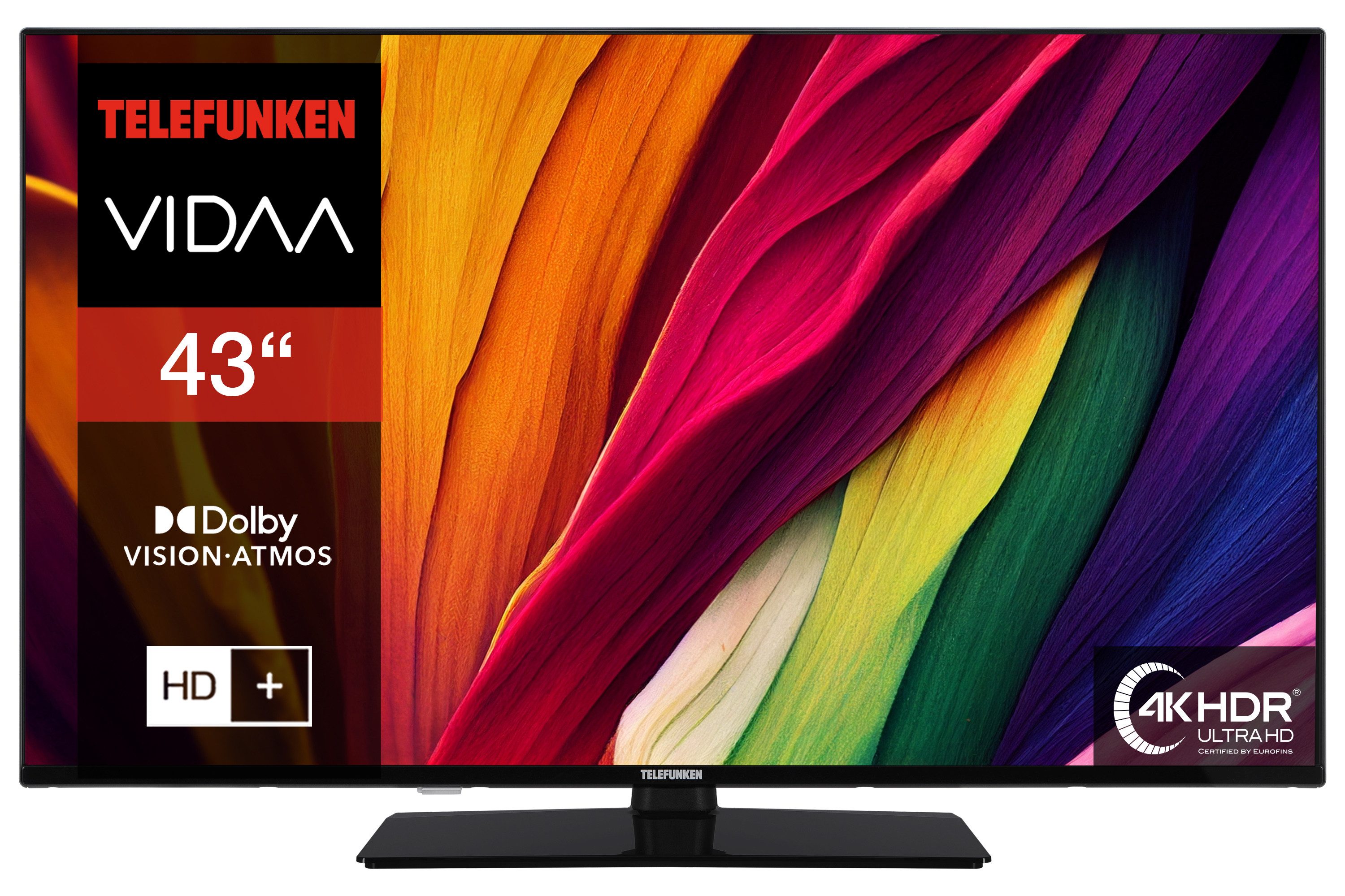 In elegantem Design vereint der XU43VP750M VIDAA Smart TV von Telefunken alles, was Fernsehen heute zum Erlebnis für Sie und Ihre Familie macht. Das auf eine Bildschirmdiagonale von 108 cm (43 Zoll) dargestellte Bild überzeugt in 4K Ultra HD Auflösung. Die Kombination aus Dolby Vision HDR, Super Resolution und Micro Dimming liefert kontrastreiche Aufnahmen mit einer natürlichen Farbgebung und beeindruckender Detailschärfe. Dank integriertem Triple-Tuner DVB-C/T2/S2 empfangen Sie Fernsehprogramme über Satellit, Kabel oder Antenne direkt auf Ihrem TV, ganz ohne zusätzlichen Receiver. Außerdem sorgen zahlreiche Anschlüsse, wie 3x HDMI (CEC + ARC), 2x USB mit Multimedia Player uvm. für multimediale Flexibilität und Vielfalt. Das VIDAA Betriebssystem hebt das smarte Fernsehzeitalter auf die nächste Stufe. Dank der vielfältigen Möglichkeiten, der einfachen Bedienbarkeit und einer großen Auswahl verschiedener Apps wie z.B. Netflix, Prime Video, Disney+, YouTube, DAZN uvm. werden Sie zum Baumeister Ihres ganz persönlichen Smart TVs.