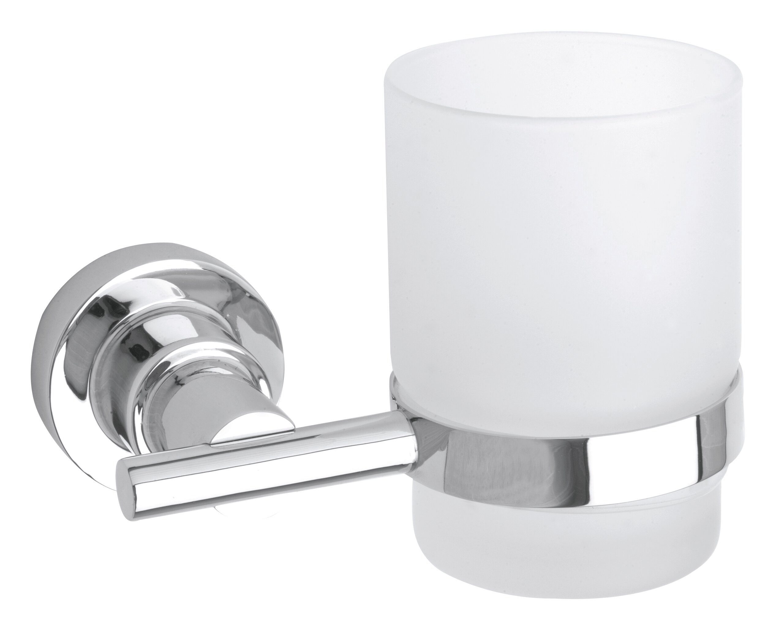 Ein attraktives Duo fürs Bad: Edler Zahnputzbecher aus satiniertem Glas, gehalten von einem edlen, verchromten Zahnbecherhalter - ein praktisches Bad-Accessoire