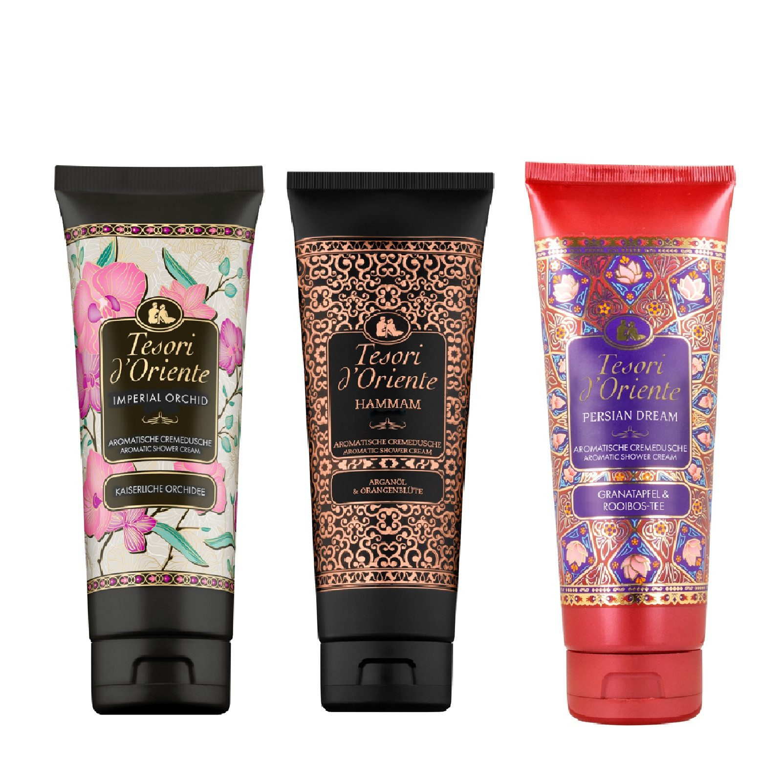 Lieferumfang | 1 x TESORI D'ORIENTE Cremedusche Imperial Orchid à 250 ml 1 x TESORI D'ORIENTE Cremedusche Hammam à 250 ml 1 x TESORI D'ORIENTE Cremedusche Persian Dream à 250 ml |