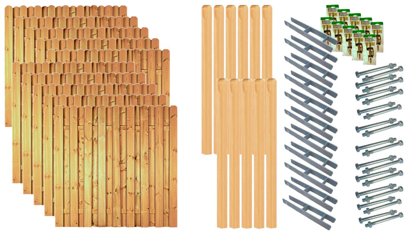 Lieferumfang | 10 Elemente 180x180 cm; 11 Pfosten 9x9x190 cm gerundet; 11 H-Pfostenträger, 10 Pakete L-Beschläge mit Schrauben; 11 Pakete Durchgangsschrauben. |