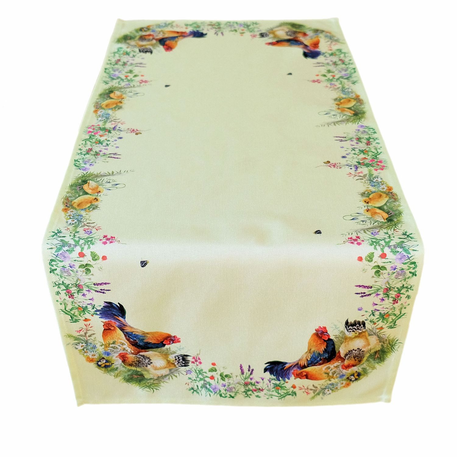 Das liebevoll gestaltete Druckmotiv von Hahn und Henne bringt ländlichen Charme und fröhliche Farben auf Ihren Tisch.