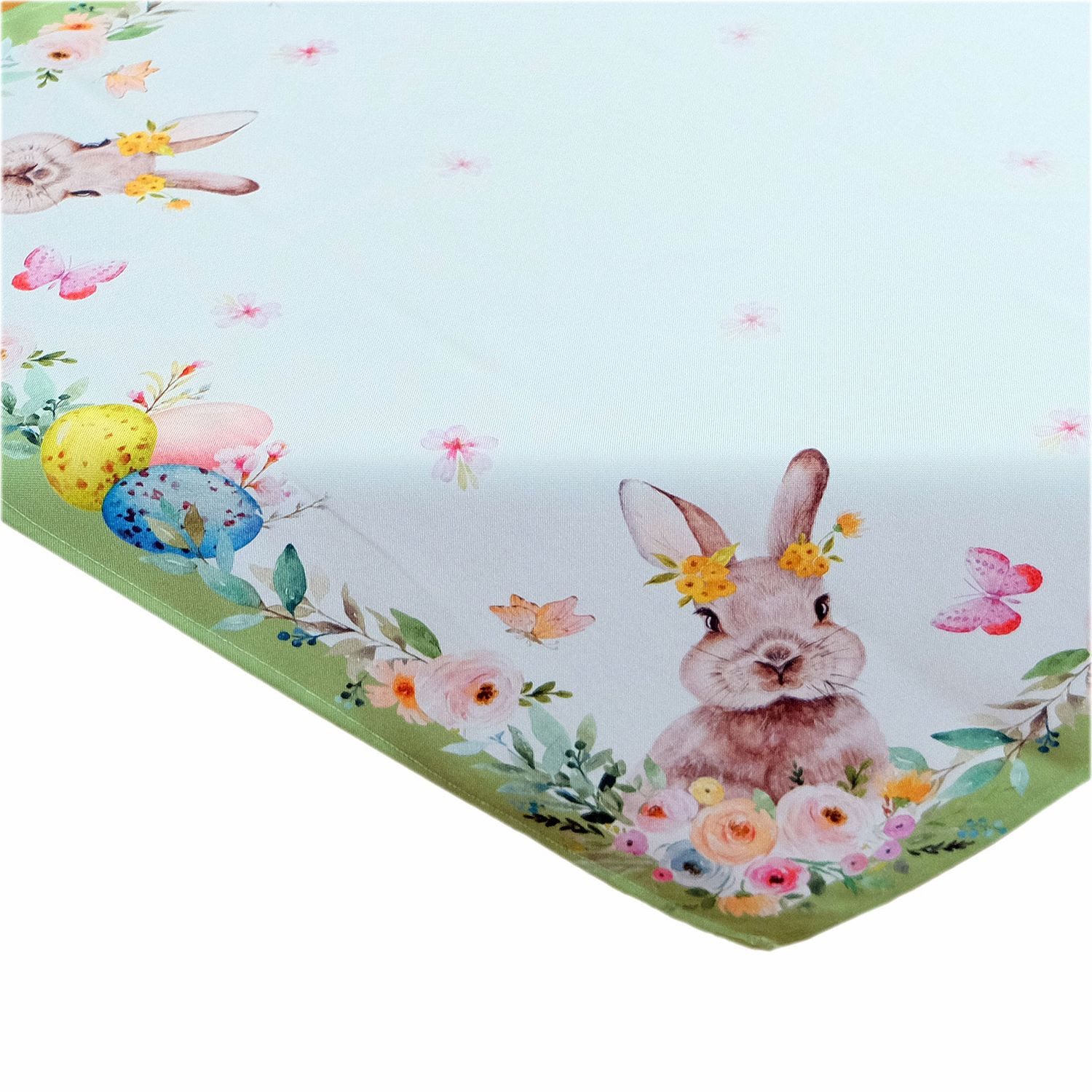 Diese fröhliche Tischdecke mit einem bunten Druck von Osterhasen und Ostereiern auf weißem Grund bringt die festliche Stimmung der Osterzeit in Ihr Zuhause.