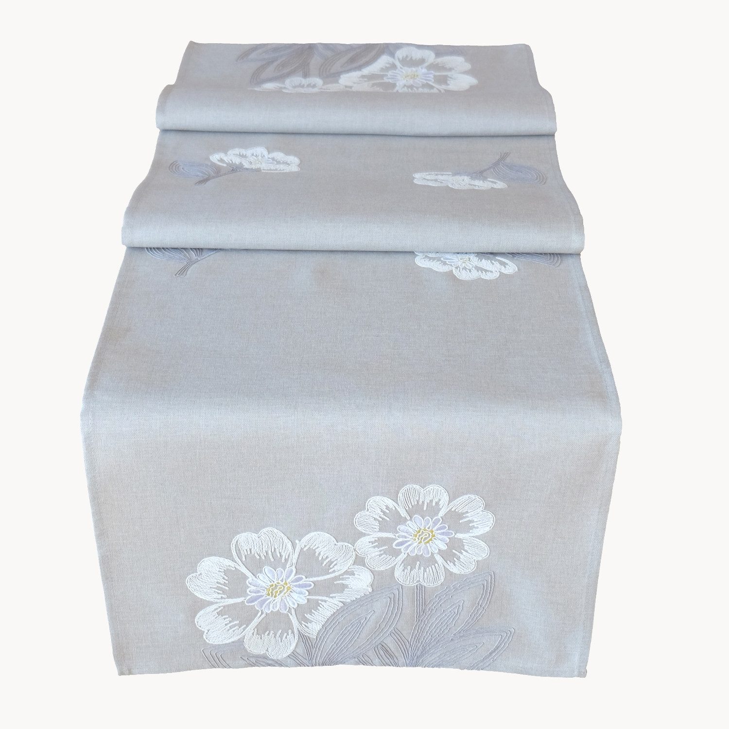 Verleihen Sie Ihrem Zuhause einen Hauch von Eleganz mit dieser blumigen Tischdecke, die mit einer feinen Stickerei von Blüten und Blumen auf grauem Grund verziert ist.