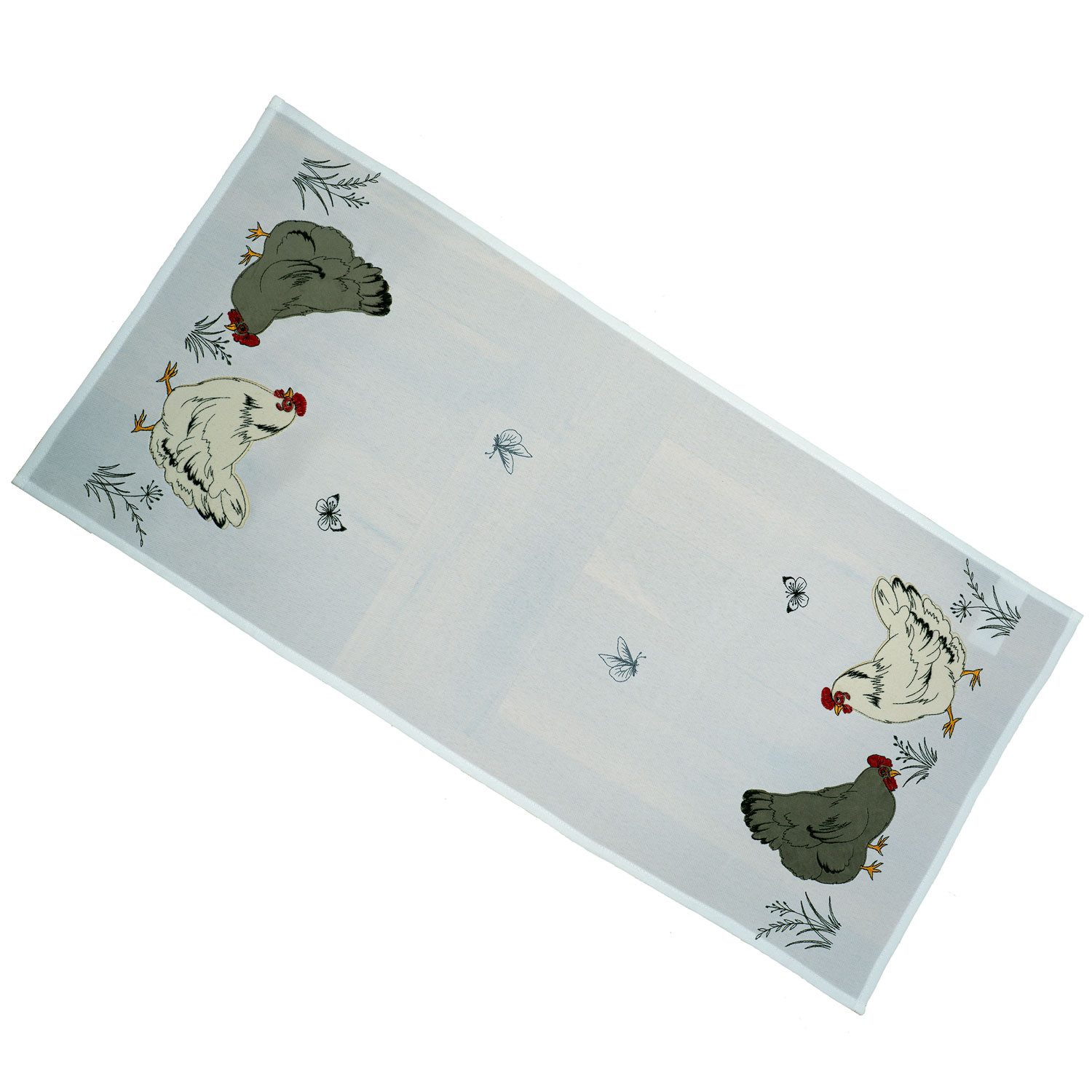 Diese bezaubernde Tischdecke mit einer liebevollen Stickerei von Hühnern und Schmetterlingen auf weißem Grund bringt fröhliche Osterstimmung in Ihr Zuhause.