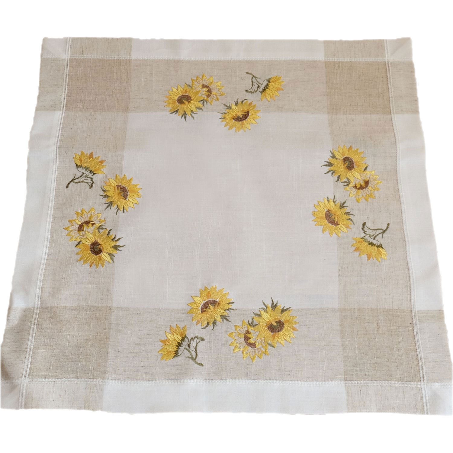 Diese charmante Tischdecke mit einer liebevollen Stickerei von Sonnenblumen auf beigem Grund bringt einen Hauch von Sommer und Frische in Ihr Zuhause.