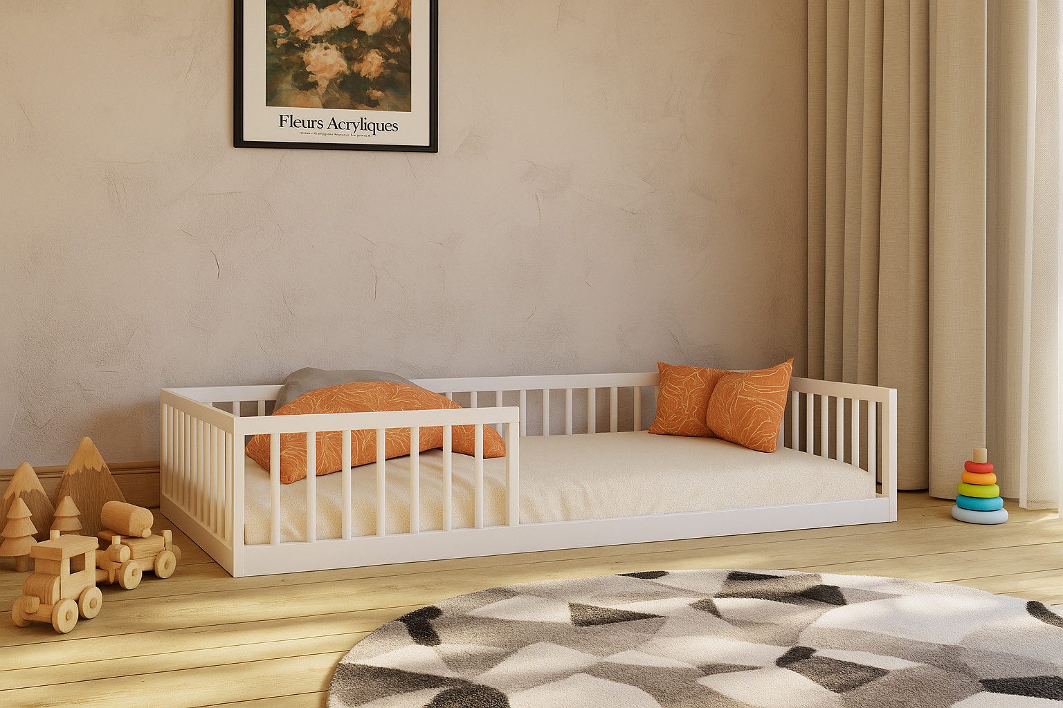 Entdecken Sie das hochwertige thematys Kinderbett BODENBETT – ein durchdacht gestaltetes Montessori-Bett für Jungen und Mädchen, das Geborgenheit, Sicherheit und eine kindgerechte Schlafumgebung vereint. Gefertigt aus massivem Kiefernholz, überzeugt dieses Bodenbett durch seine natürliche Optik und besonders hohe Stabilität. Die Oberfläche ist fein geschliffen und wirkt warm und einladend – perfekt für jedes Kinderzimmer.