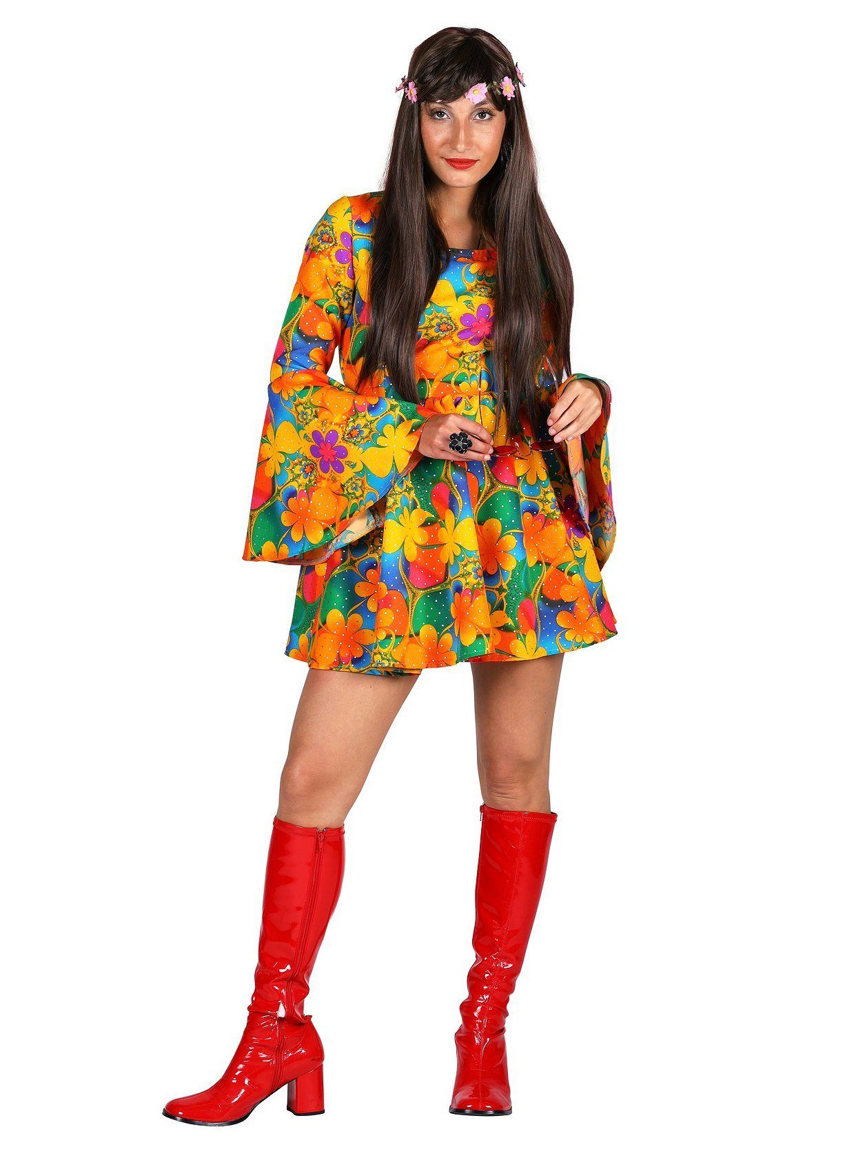 thetru Hippie-Kostüm Hippie Minikleid orange - Kostüm für Fasching, Langärmeliges Mini-Kleid in Blumen-Optik