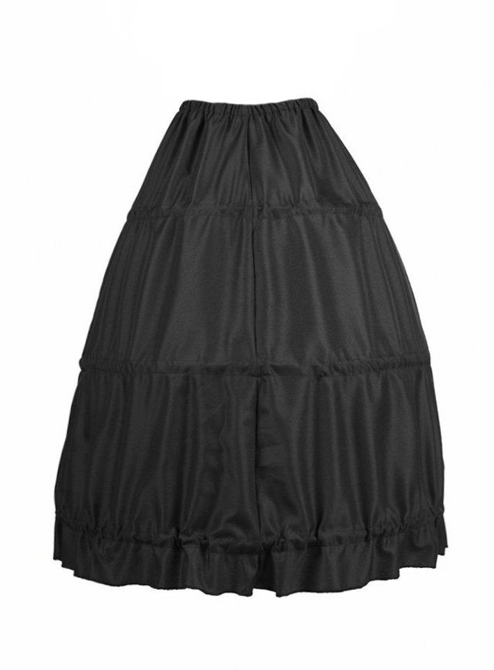 Unsere Krinoline besteht aus festem, schwarzen Stoff, durch den kein Untergewand durchblitzen kann und wird durch die eingenähten, leichten Reifen in drei sich verbreiternde Segmente unterteilt. Dadurch erhält er seine typische Kegelform. Mit einem Durchmesser von etwa 120cm bringt der größte Reifen es auf ein stattliches Format. Der obere Saum besteht aus einem Gummizugbund, wodurch der Unterrock besonders angenehm zu tragen ist. Mit diesem Reifrock wird jedes Kostüm zu einem üppigen Festtagsgewand!