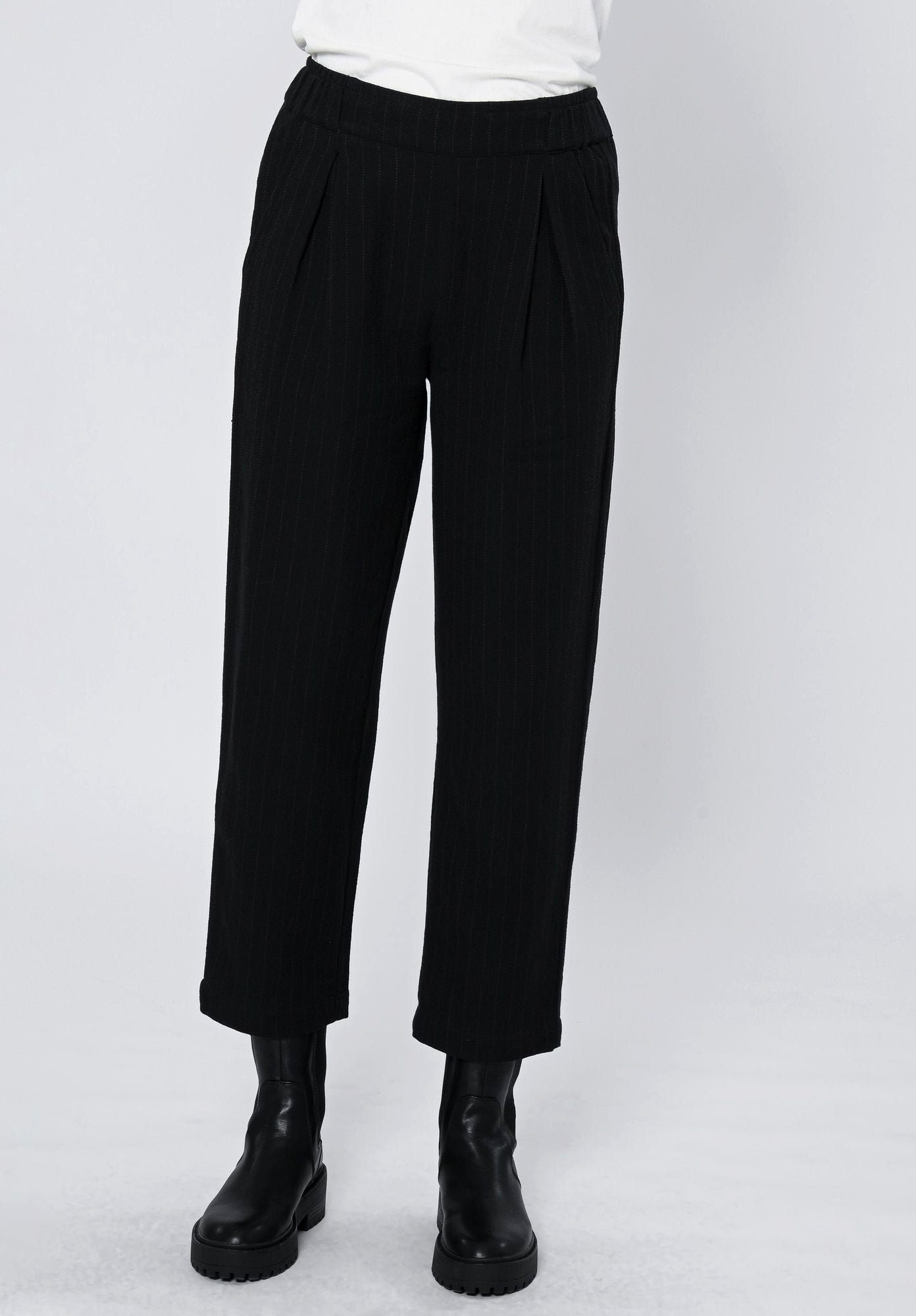 Schicke Bundfalten Stoffhose aus weicher Biobaumwolle mit Nadelstreifen, zwei Seitentaschen, einem elastischen Gummibund und dezenter ThokkThokk Logo Stickerei auf der Gesäßtasche.