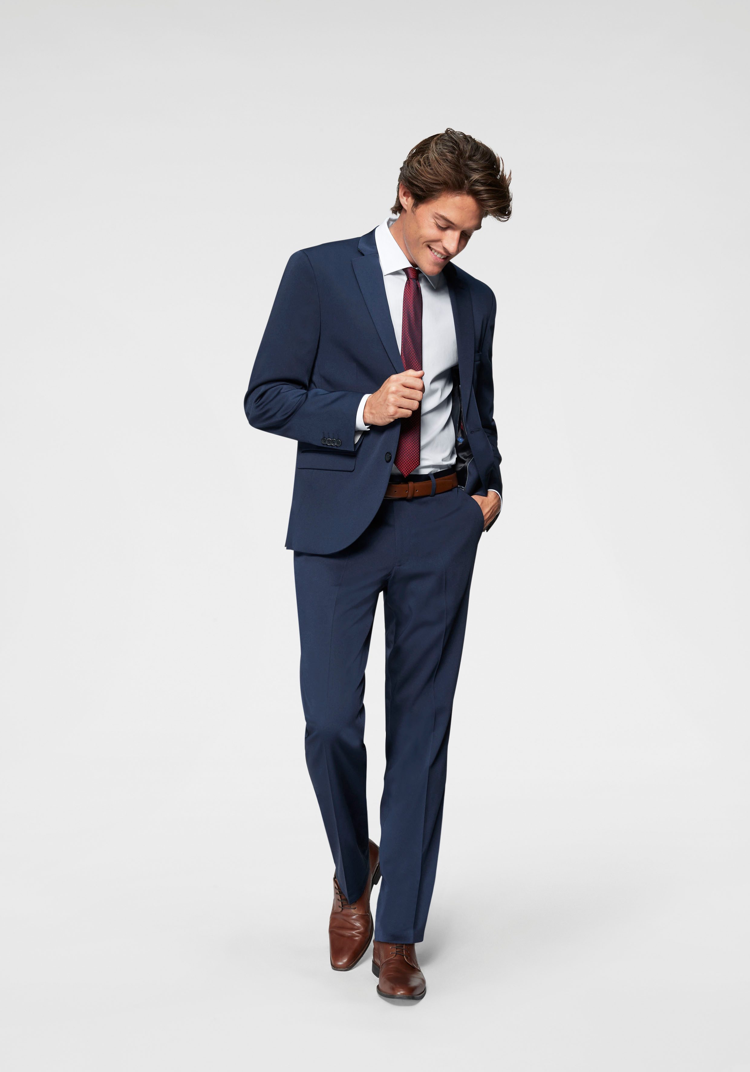 10182 ist der perfekte Anzug für den stilsicheren Mann von heute. Er wirkt edel, jedoch lassen sich Sakko und Weste auch mit Jeans und T-Shirt zu einem legeren Look kombinieren. Insgesamt bietet der Anzug genügend Staumraum für alle notwendigen täglichen Begleiter. Modisch geschnitten und in edlem Glanz präsentiert sich der 2-teilige Anzug von Thomas Goodwin als unkomplizierte Herrengarderobe für Geschäftstermine oder Feierlichkeiten. Klassische Ausstattung mit Außen- und Innentaschen und obligatorischer Brusttasche für das Einstecktuch am Sakko sowie zwei seitlichen Eingrifftaschen, knöpfbare Gesäßtasche und Gürtelschlaufen an der Stoffhose treffen auf einen modischen Slim-fit-Style. Mit Hemd und Krawatte kannst du den Anzug festlich-vornehm kombinieren, mit Poloshirt setzt du einen dezenten Casual-Akzent. Und auch mit deiner