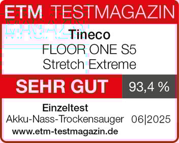 Testurteil von etm-testmagazin.de vom 02.06.2025, Ausgabe 06|2025, Seite tests/der-floor-one-s5-stretch-extreme-von-tineco-im-test-2025/: "SEHR GUT | 93,4 %"