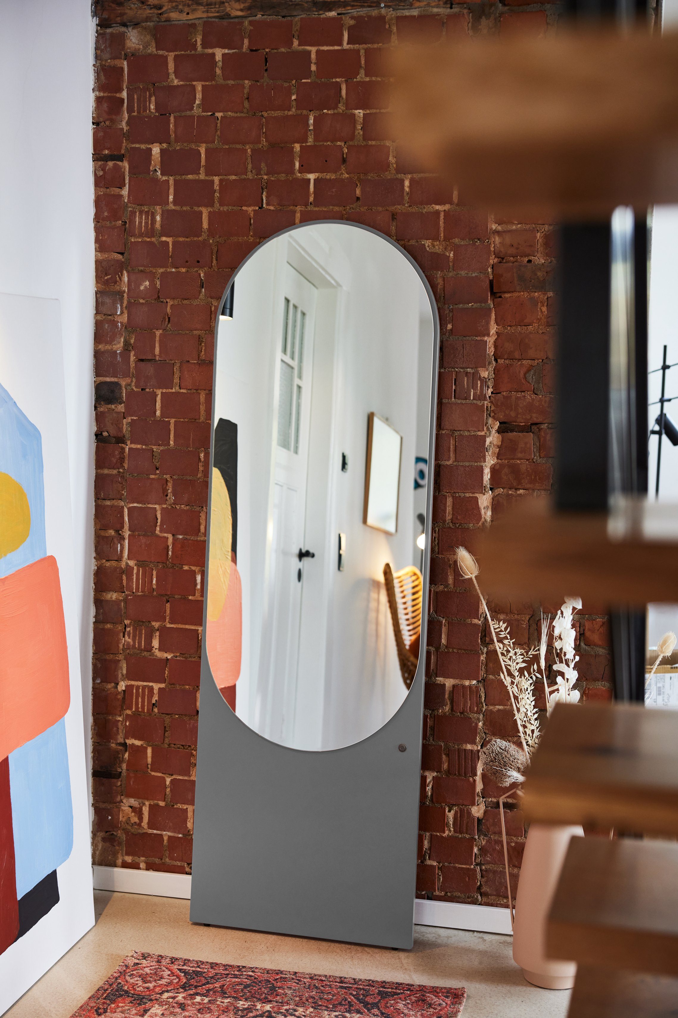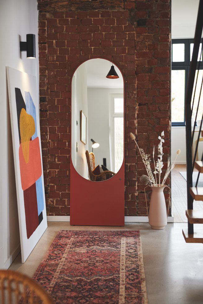 Aufbauhinweise | Standspiegel an der Wand mit mitgeliefertem Kippschutz sichern. |