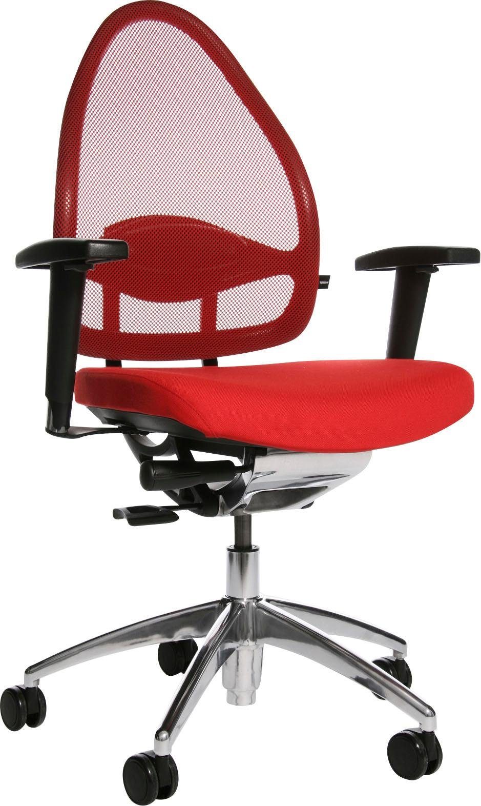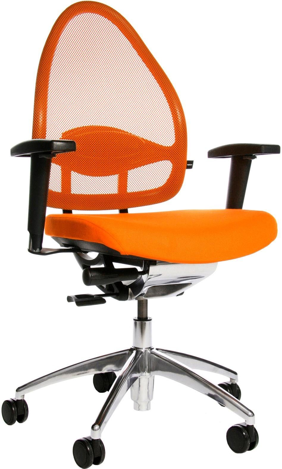 Drehstuhl in Netzoptik. Stufenlose Sitzhöhenverstellung mit Toplift. Netz-Rückenlehne mit integriertem Body-Balance-Tec®-Gelenk und höhenverstellbarer Lordosenstütze. Bequemer Komfort-Muldensitz mit abgerundeter Sitzvorderkante. Syncro-Relax-Mechanik mit extra großem Öffnungswinkel, in vorderster Position arretierbar. Design-Fußkreuz Aluminium poliert, ausgerüstet mit lastabhängig gebremsten Sicherheitsdoppelrollen für Teppichböden. Inklusive höhenverstellbare Armlehne »T2(OPA)«. Strapazierfähiger und robuster Stoffbezug aus 100 % Trevira CS - Rückenlehne in Netzgewebe aus 100 % Polyester. Dieses Modell trägt das GS-Zeichen der Intertek in Fürth und erfüllt in diesem Zusammenhang sämtliche sicherheitsrelevanten Voraussetzungen.