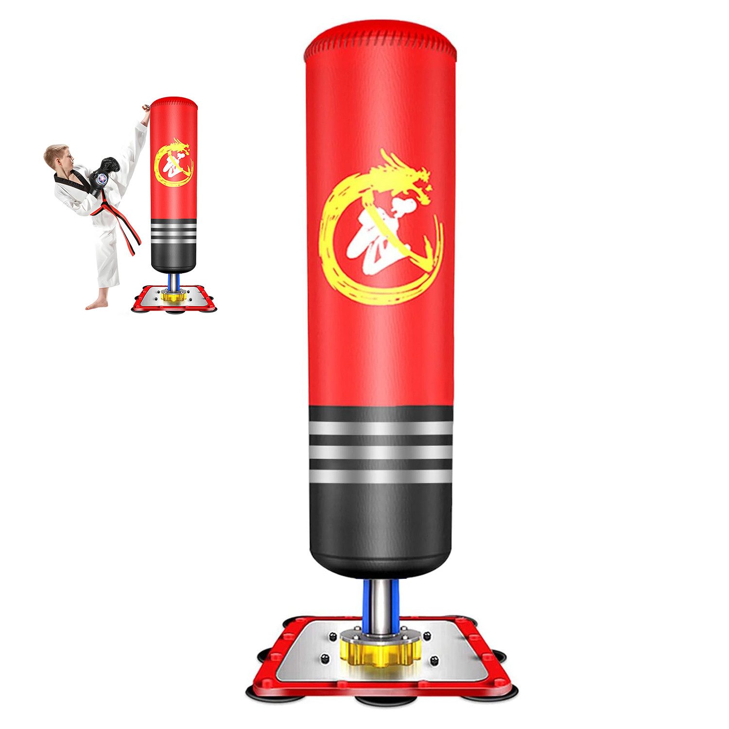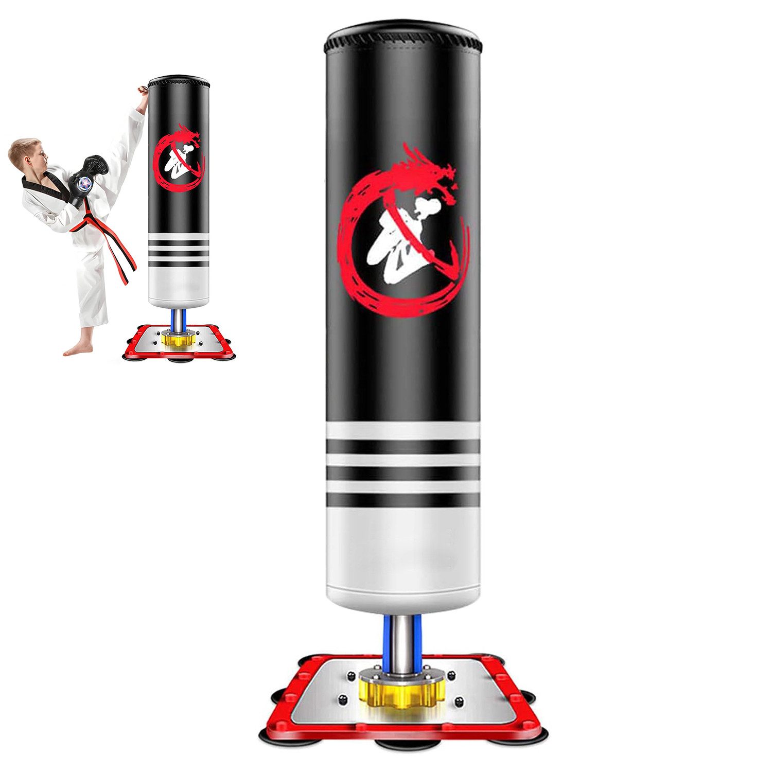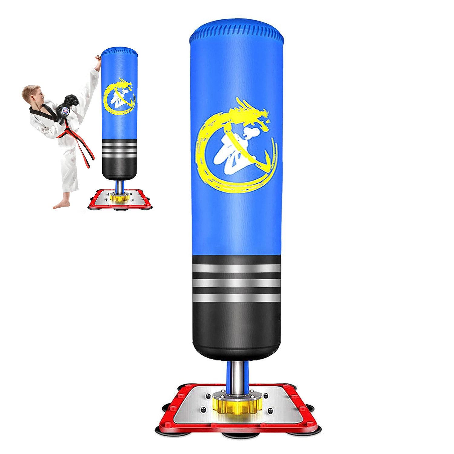 Freistehender Kickboxing tasche: Bereit für den Einsatz, ohne Sand- oder Wassereinfüllung dank des starken Stahlsaugers.