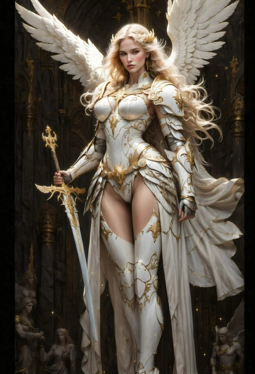 TPFLiving Kunstdruck (OHNE RAHMEN) Poster - Leinwand - Wandbild, Fantasy Himmlische Engel Weiblicher Erzengel Goldene Flügel Leinwand (Leinwandbild XXL), Farben: Gelb, Braun, Schwarz, Weiß, Grau -Größe: 20x30cm