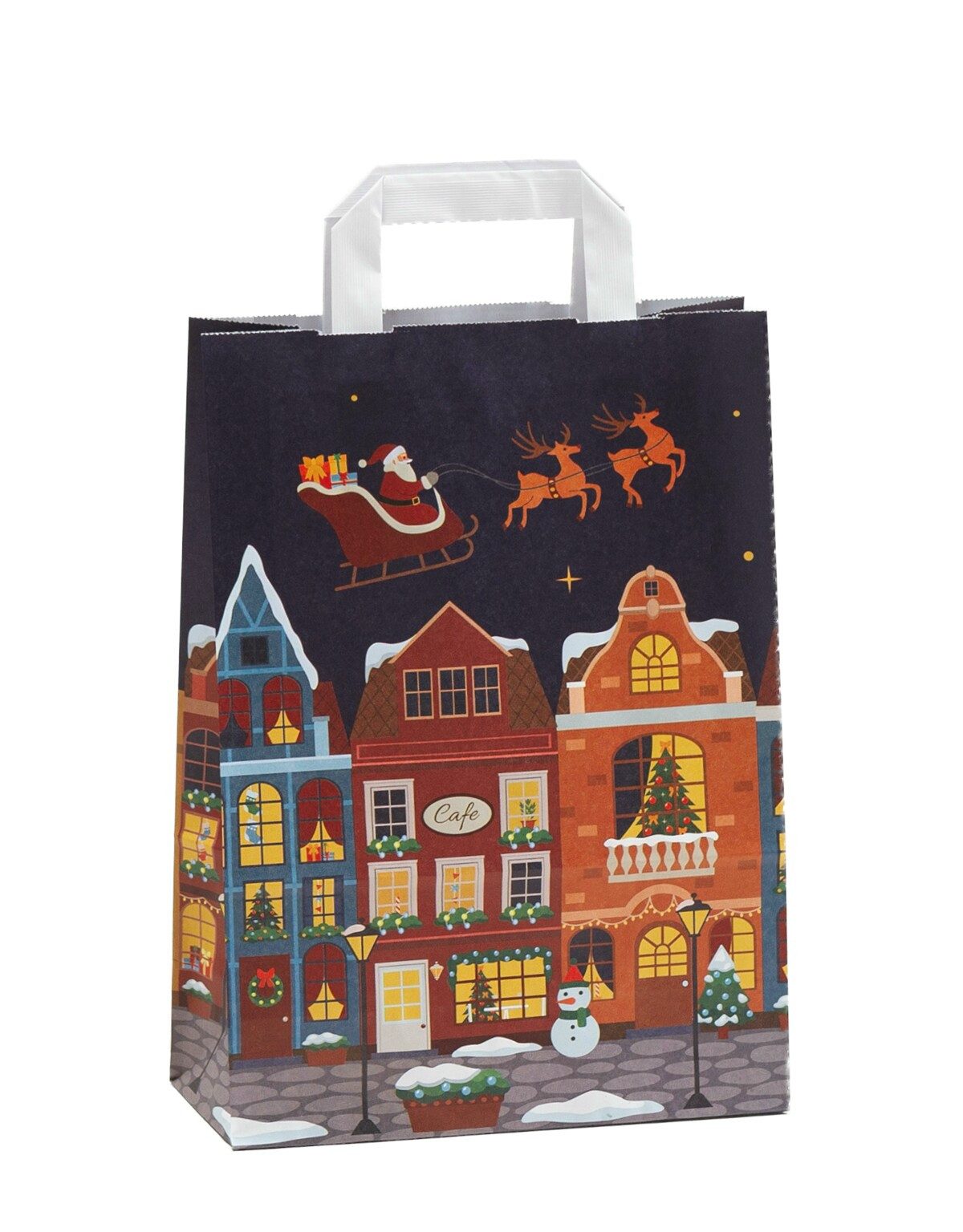 Die Papiertragetasche „Weihnachtsabend“ bringt festliche Stimmung in jedes Geschäft. Mit ihrem detailreichen und stimmungsvollen Winterstadt-Motiv zeigt sie liebevoll gestaltete Häuserzeilen, leuchtende Fenster, Schneemänner und einen fröhlichen Weihnachtsmann im Schlitten – perfekt für die Weihnachtszeit.