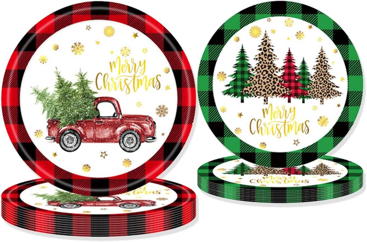 Weihnachtsthema-Design – Die Teller sind rund mit einem klassischen rot-schwarzen, grün-schwarzen Büffelkaro-Hintergrund um den Rand und einem roten LKW- und Kiefernbaummuster in der Mitte gedruckt, was eine fröhliche und festliche Atmosphäre für Ihre Party schaffen kann.