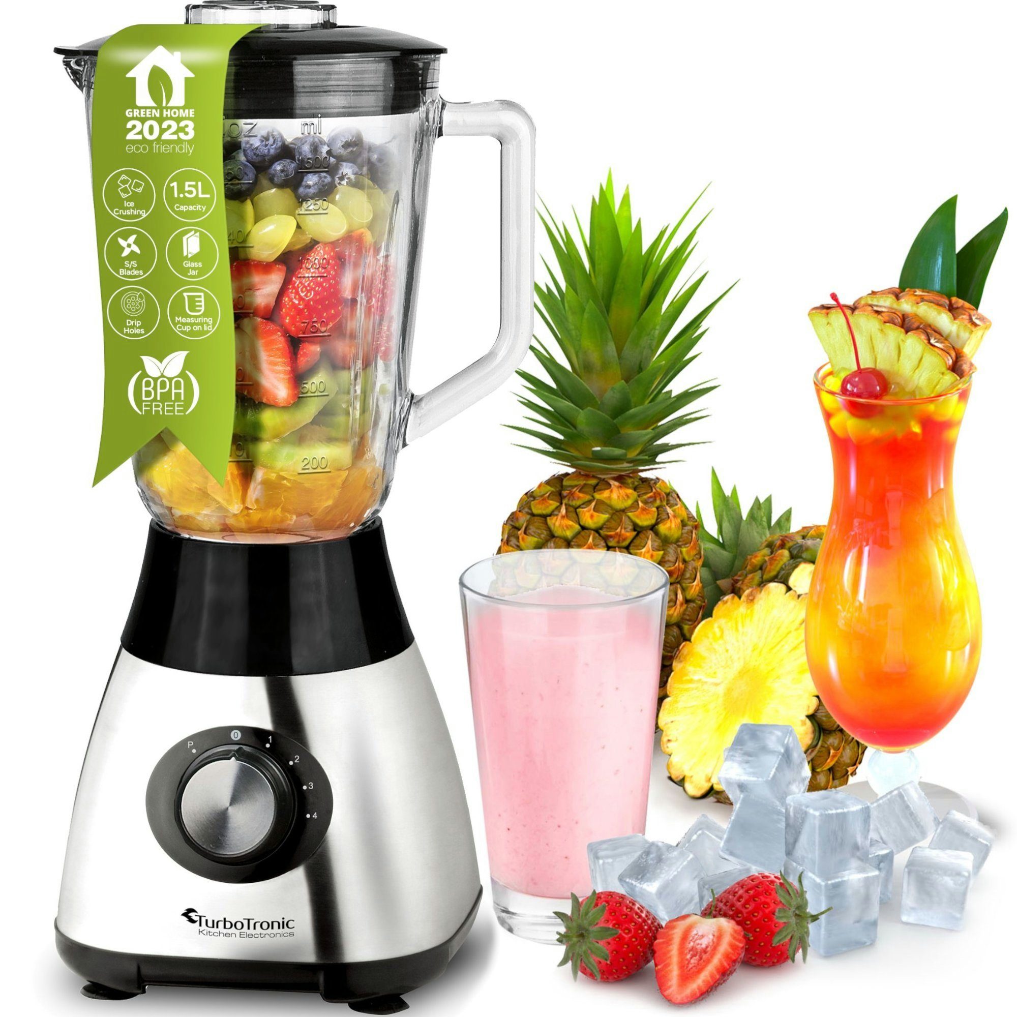 Top-Features | 1200 Watt Leistung, 1,5 Liter Glas-Mixbehälter, geeignet für Smoothies, Milchshakes, Eiscreme und mehr, Eis-Crush-Funktion, Edelstahlmesser mit 4 geschliffenen Klingen, 4 Geschwindigkeitsstufen und Pulse-Funktion, lebensmittelechte Materialien, einfache Reinigung |