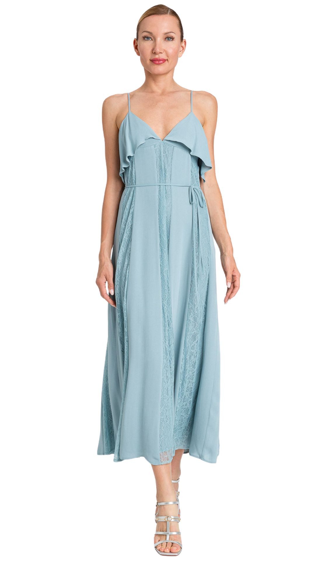 NEU TWINSET NEU . Maxikleid aus Viskosekrepp mit Einsätzen aus Chantillyspitze, V-Ausschnitt und schmalen Trägern, mit Rüschenapplikationen und einen passenden Gürtel, Reißverschluss an einer Seite, weit geschnittenes und gefüttertes Kleidungsstück.