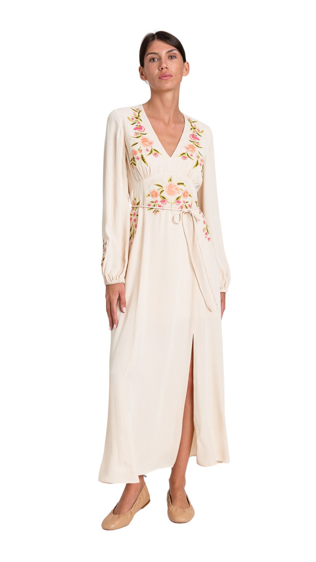 NEU TWINSET NEU . Maxikleid aus Viskosekrepp mit leichter floraler Vollgarnstickerei, V-Ausschnitt - abgerundete Taillennaht - ausgestellte Rockpartie mit Schlitz, lockere Ärmel mit Gummizug im Saum - tiefen Rückenausschnitt, Reißverschluss an der Seite - eine „Oval T“-Logoplakette an der Rückseite, abnehmbarer schmaler Gürtel.