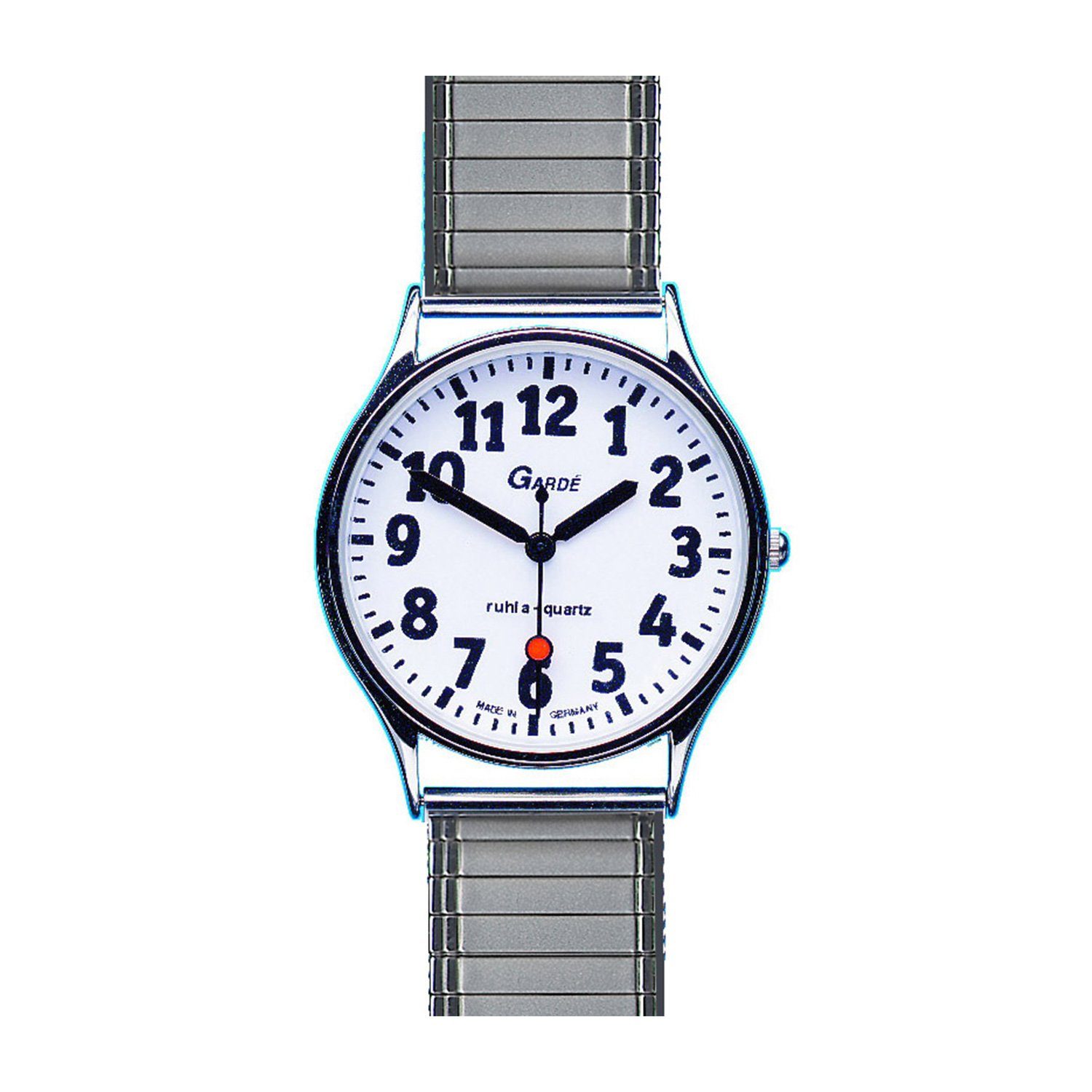 • Versehen ist die Armbanduhr mit einem KONTRASTREICHEN Zifferblatt (schwarze Ziffern auf weißem Grund) sowie mit EXTRA GROSSEN ZIFFERN und ROTER Sekunde.