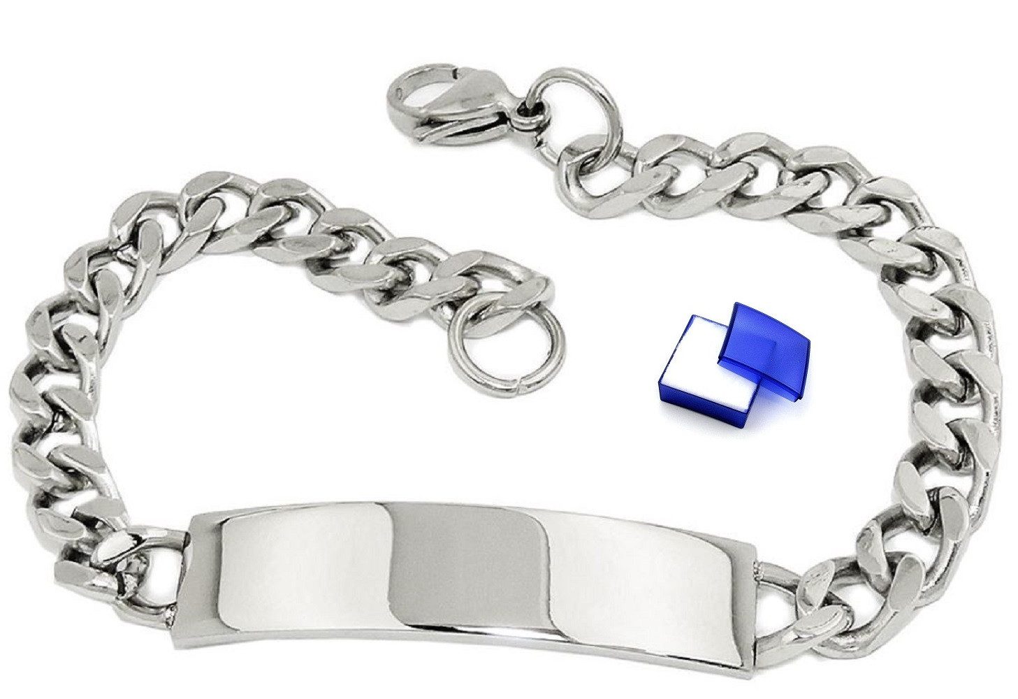 Echt stark! Stabiles Edelstahl-Armband, 6,5mm breit, 20cm lang, Gravurplatte 39x9mm. Das robuste Armband wird mit einem Karabiner verschlossen und wird hauptsächlich als Männerschmuck getragen. Ein Armband ist zur Freude des Schmuckträgers immer im eigenen Blickwinkel und umspielt sexy das Handgelenk.