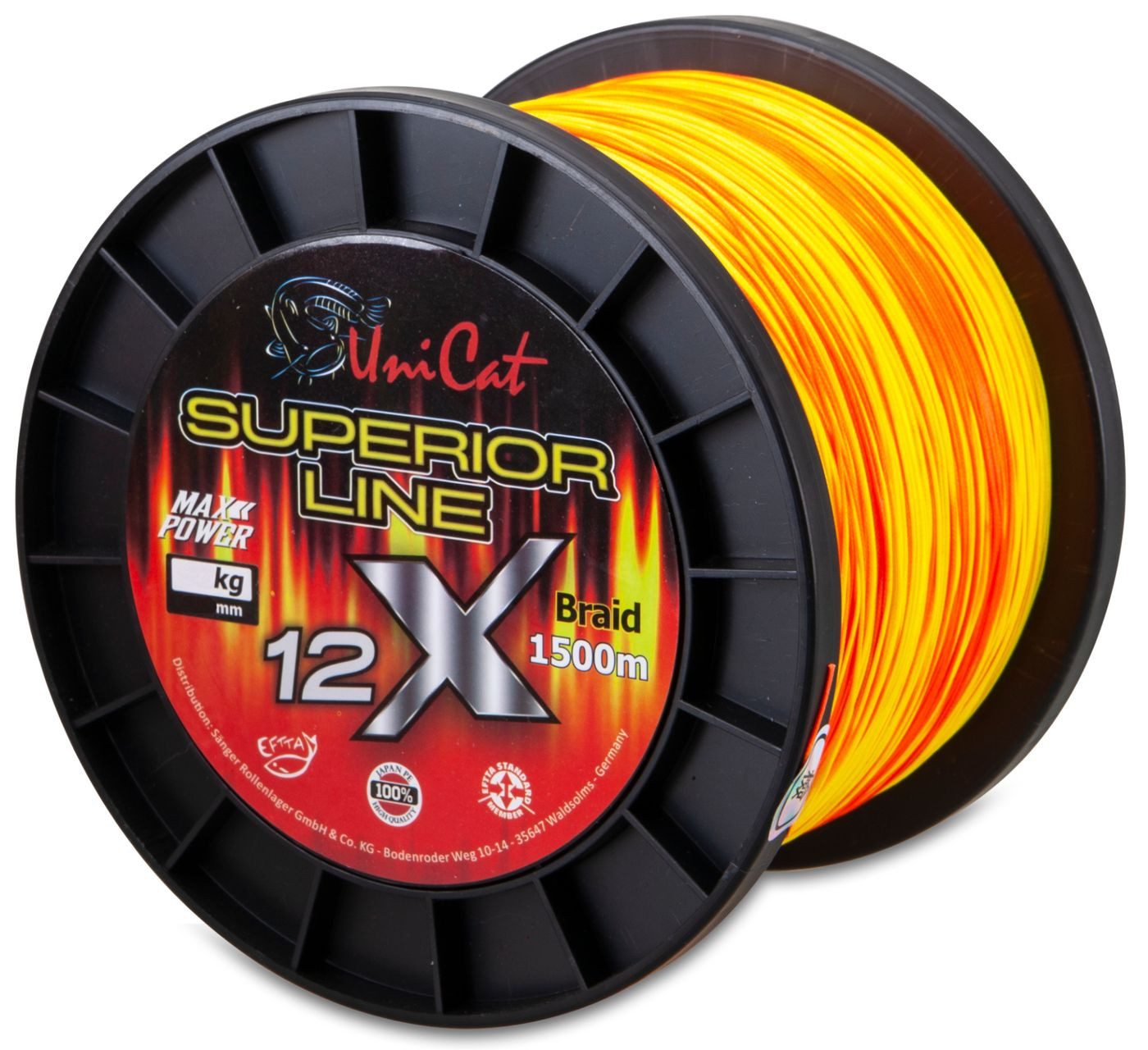 Uni Cat Superior Line 12X Braid - Wallerschnur - Die geflochtene Welsschnur von Uni Cat ist eine sehr gute Angelschnur zum aktiven und passiven Wallerangeln. Die Geflechtschnur weist sehr hohe Tragkraftwerte, eine hohe Abriebfestigkeit und eine gute Knotenfestigkeit auf, wodurch sie den hohen Belastungen beim Welsangeln problemlos standhält und sich kampfstarke Großwelse sicher ausdrillen lassen. Dank der sehr engen und 12-fachen Flechtung nimmt die Wallerschnur nahezu kein Wasser auf. Zudem besitzt die Geflechtschnur eine weiche und sehr glatte Oberfläche und aufgrund ihrer Färbung weist sie eine hohe Sichtbarkeit beim Welsangeln auf. Ob zum Distanzfischen mit der Boje, zum Abspannen, U-Posenangeln oder für schweres Spinnfischen und Vertikalangeln, die geflochtene Schnur deckt beim Angeln auf Wels viele Einsatzgebiete ab.