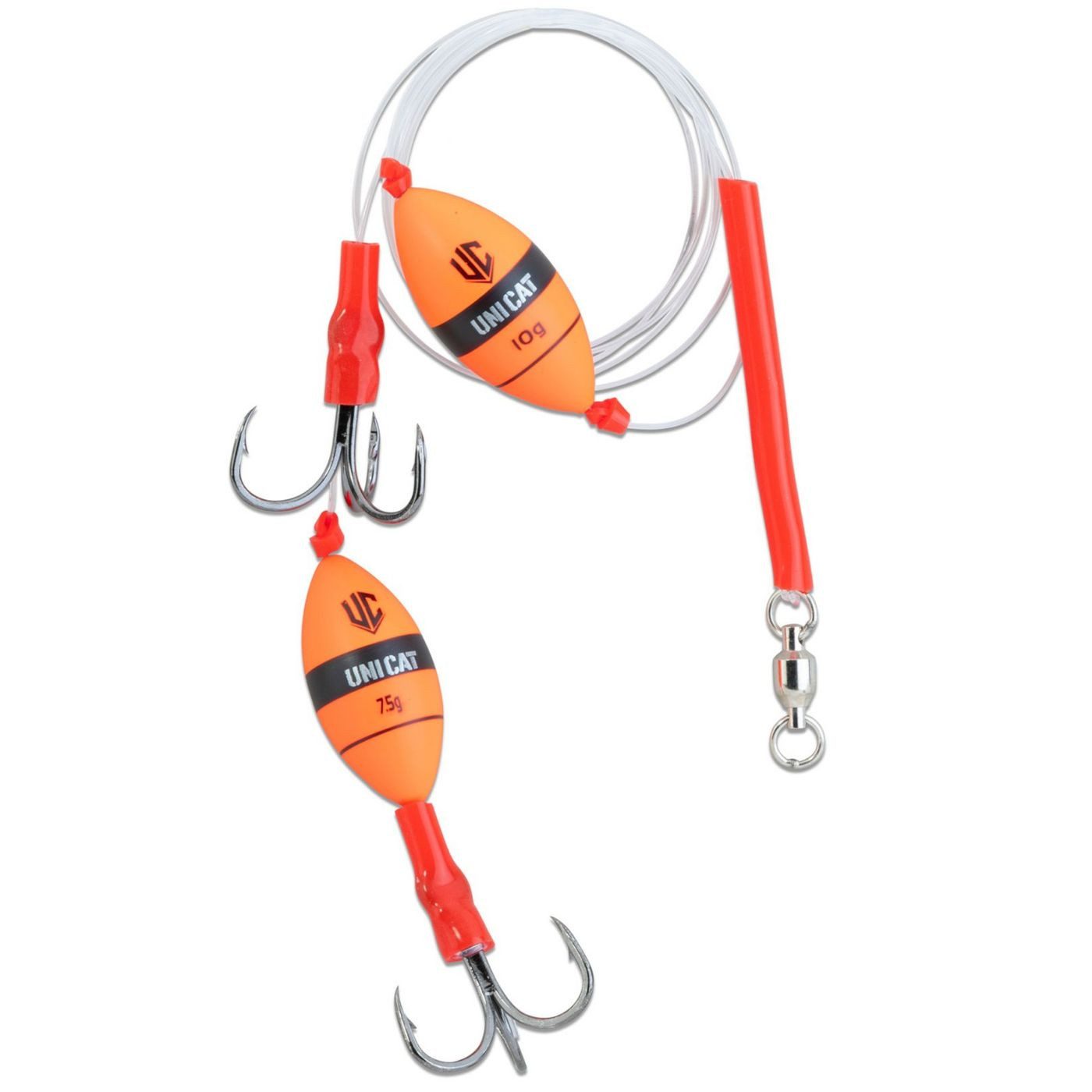 UNI CAT Smelly Bait GT-41 Rig - Gut austarierte U-Posenmontagen für das Fischen mit Köderfischen und Naturködern auf Wels. Всі Profi Rigs sind mit KONA© Haken ausgestattet und SB gepackt. Gebunden an Extreme Mono Line Ø 1,15 mm. Es handelt sich um eine ausbalancierte Haarmontage, bestehend aus zwei hintereinander liegenden Drillinge für Köderfische. Das Rig ermöglicht eine schwerelose Präsentation dank zwei kleinen, roten U-Posen. Besonders geeignet für Köder, die mit Lockstoff besprüht werden.