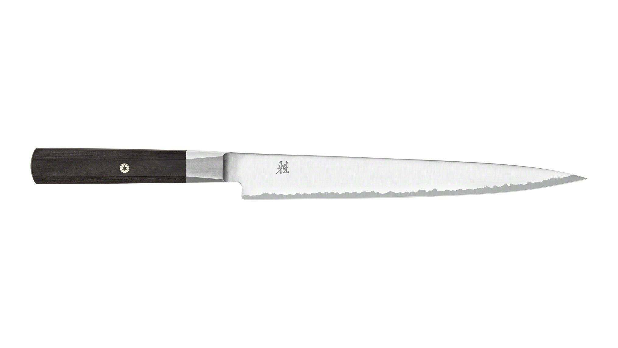 MIYABI SUJIHIKI MIYABI 4000FC 240 mm 9 1/2 " Hergestellt in Japan Die MIYABI 4000FC Messerserie bringt Ihnen eine traditionsreiche japanische Handwerkskunst näher, in der sich jedes Messer durch Schönheit und Schärfe auszeichnet. Dazu zählt auch dieses Sujihiki mit einer Klingenlänge von 240 mm und beidseitig abgezogener, langer schmaler Klinge. Mit seiner Form und Flexibilität eignet es sich hervorragend zum Schneiden und Tranchieren aller Fisch- und Fleischarten. Die FRIODUR Messerklinge ist aus FC61-Stahl gefertigt. Dieser wurde zweifach eisgehärtet, um ihm hohe Härte und Haltbarkeit zu verleihen. Eine weitere Besonderheit ist der extrem feine Katana-Edge-Schliff. Kenner schätzen diesen Schliff wegen seiner hohen Schärfe und Schnitthaltigkeit, den man übrigens auch bei japanischen Schwertern findet. Mit seiner unverkennbaren Optik gilt der Katana-Edge-Schliff als Zeichen meisterlichen Messerhandwerks. Nicht nur aus ästhetischen Gründen ist das MIYABI 4000FC mit einem achteckig geformten Griff und Kropf ausgestattet: Schon beim ersten Schnitt spüren Sie, wie komfortabel und sicher das japanische Kochmesser in der Hand liegt. Und auch längeres Arbeiten in der Küche gelingt ermüdungsfrei. Beim Holzgriff handelt es sich übrigens um imprägniertes, formstabiles Pakkaholz, veredelt mit einem Mosaikpin. Für alle MIYABI Messer gilt „made in Japan“. ZWILLING lässt in einer eigenen Manufaktur im japanischen Seki fertigen und bringt dabei die deutsche Ingenieurskunst aus Solingen ein. Sujihiki mit 240 mm Klingenlänge FRIODUR Messerklinge aus FC61-Spezialstahl mit zweifacher Eishärtung Katana-Edge-Schliff, sehr scharf und lange schnitthaltig Achteckig geformter Pakkaholzgriff und Kropf – funktional und edel Eingraviertes MIYABI Logo als Qualitätsmerkmal
